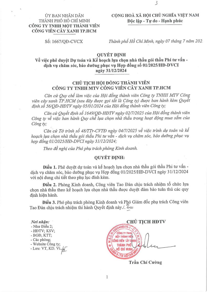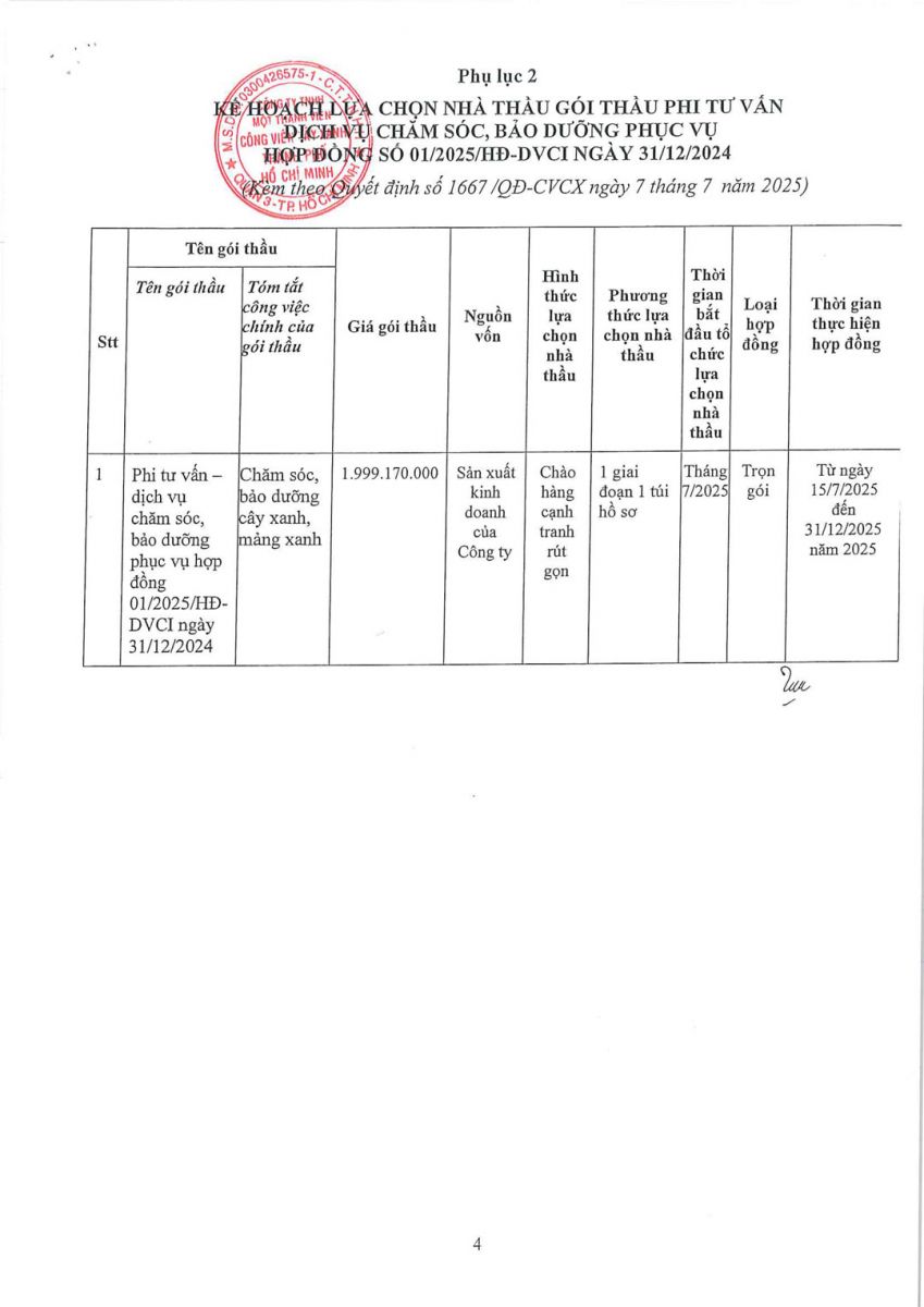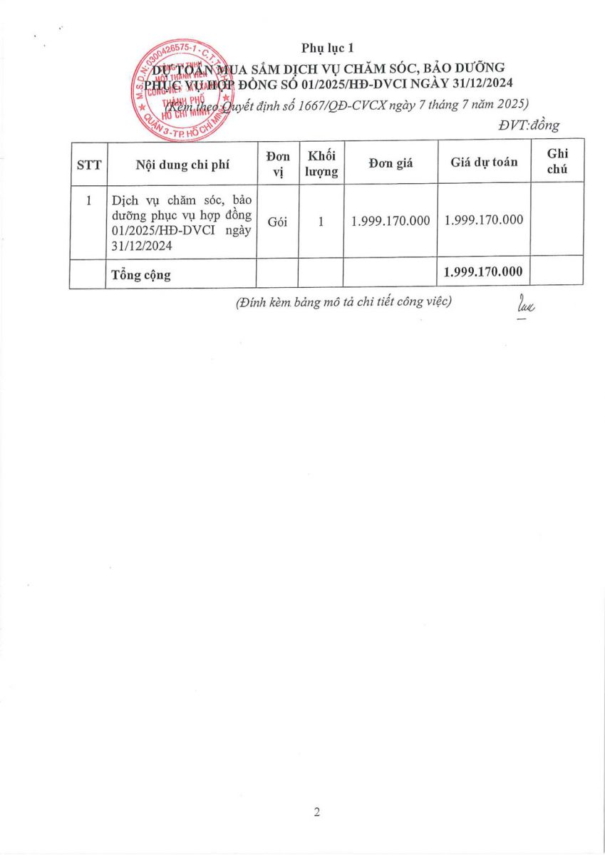 Quyết định phê duyệt dự toán và kế hoạch lựa chọn nhà thầu gói thầu phi tư vấn dịch vụ chăm sóc, bão dưỡng phục vụ Hợp đồng số 01/2025/HĐ-DVI ngày 31/12/2024