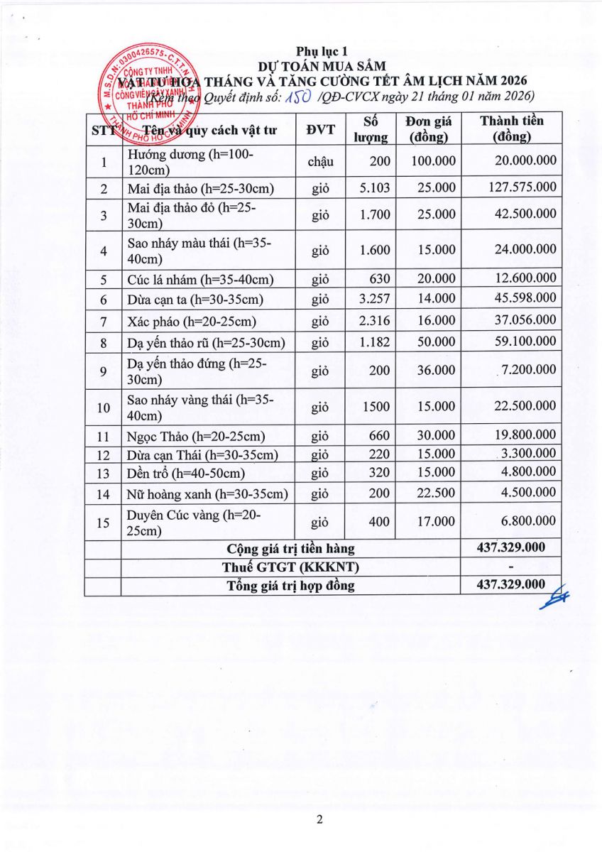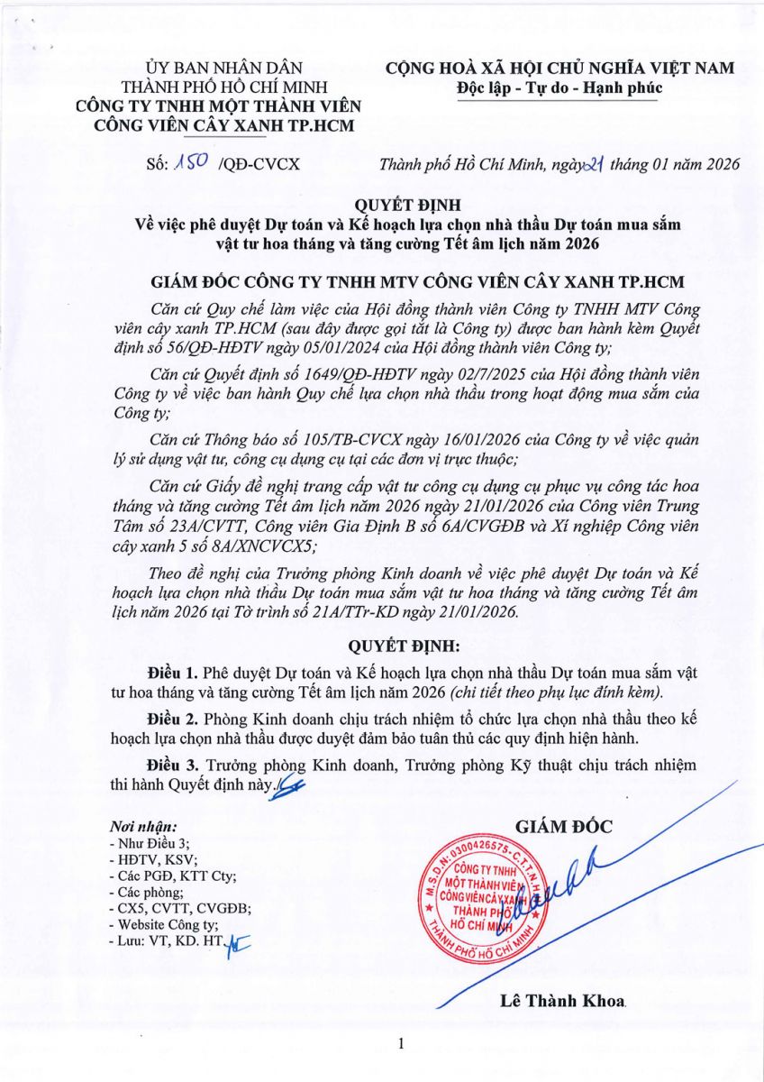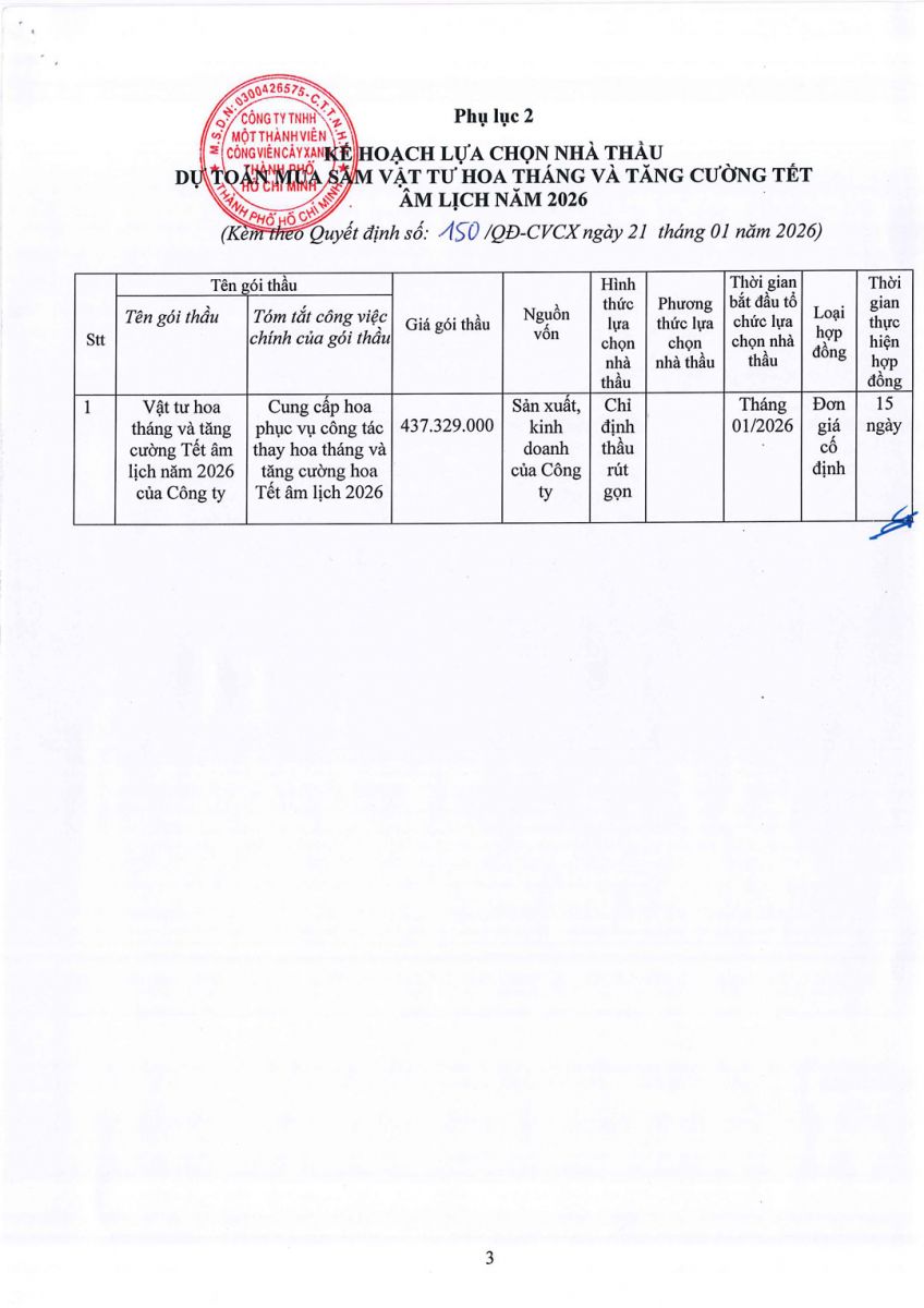 Quyết định số 150/QĐ-CVCX ngày 21/01/2026 của Công ty về việc phê duyệt Dự toán và Kế hoạch lựa chọn nhà thầu vật tư hoa tháng và tăng cường Tết âm lịch năm 2026