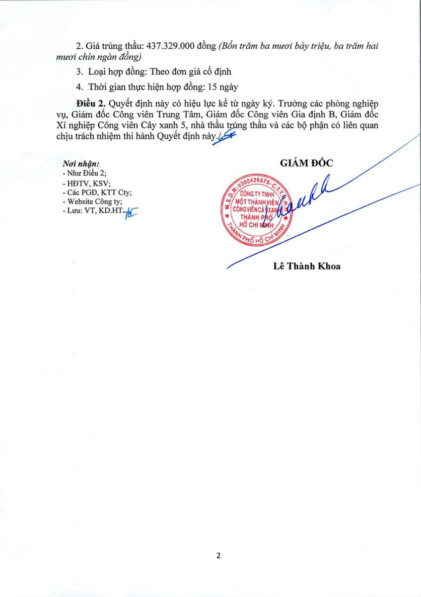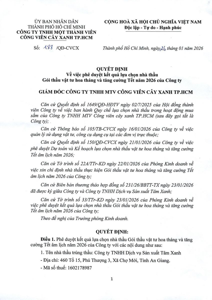 Quyết định số 188/QĐ-CVCX ngày 26/01/2026 của Công ty về việc phê duyệt kết quả lựa chọn nhà thầu Gói thầu vật tư hoa tháng và tăng cường Tết âm lịch năm 2026 của Công ty