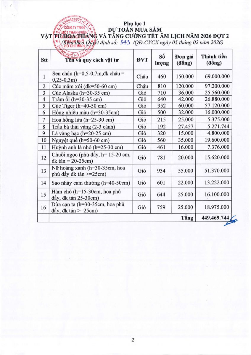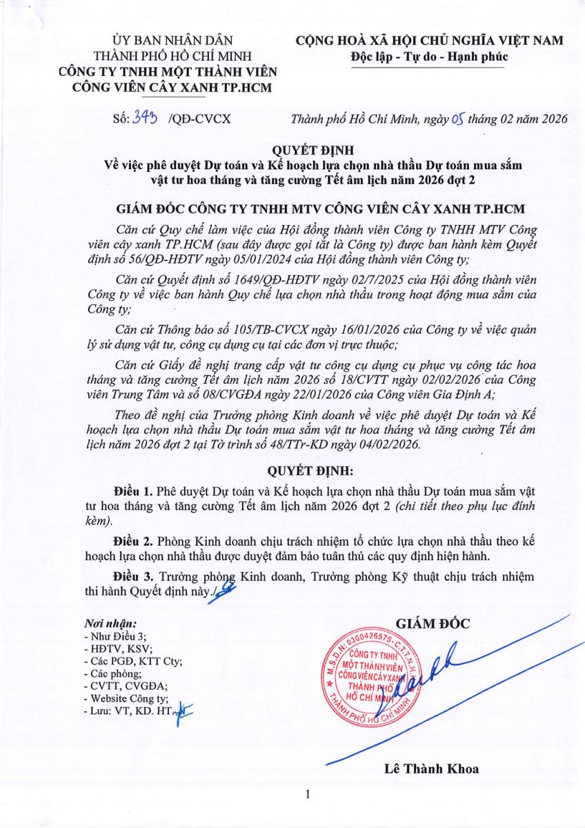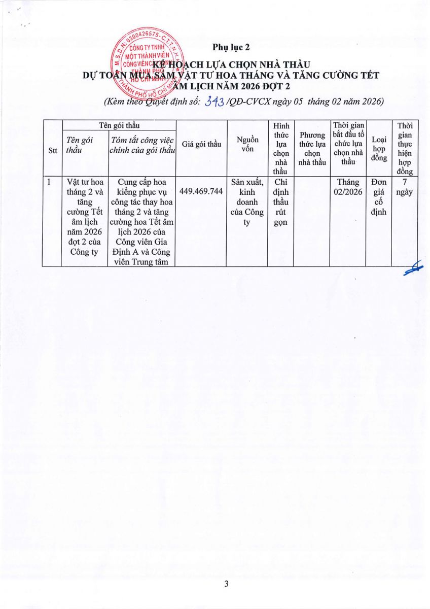 Quyết định số 343/QĐ-CVCX ngày 05/02/2026 của Công ty về việc phê duyệt Dự toán và Kế hoạch lựa chọn nhà thầu Dự toán mua sắm vật tư hoa tháng và tăng cường Tết âm lịch năm 2026 đợt 2