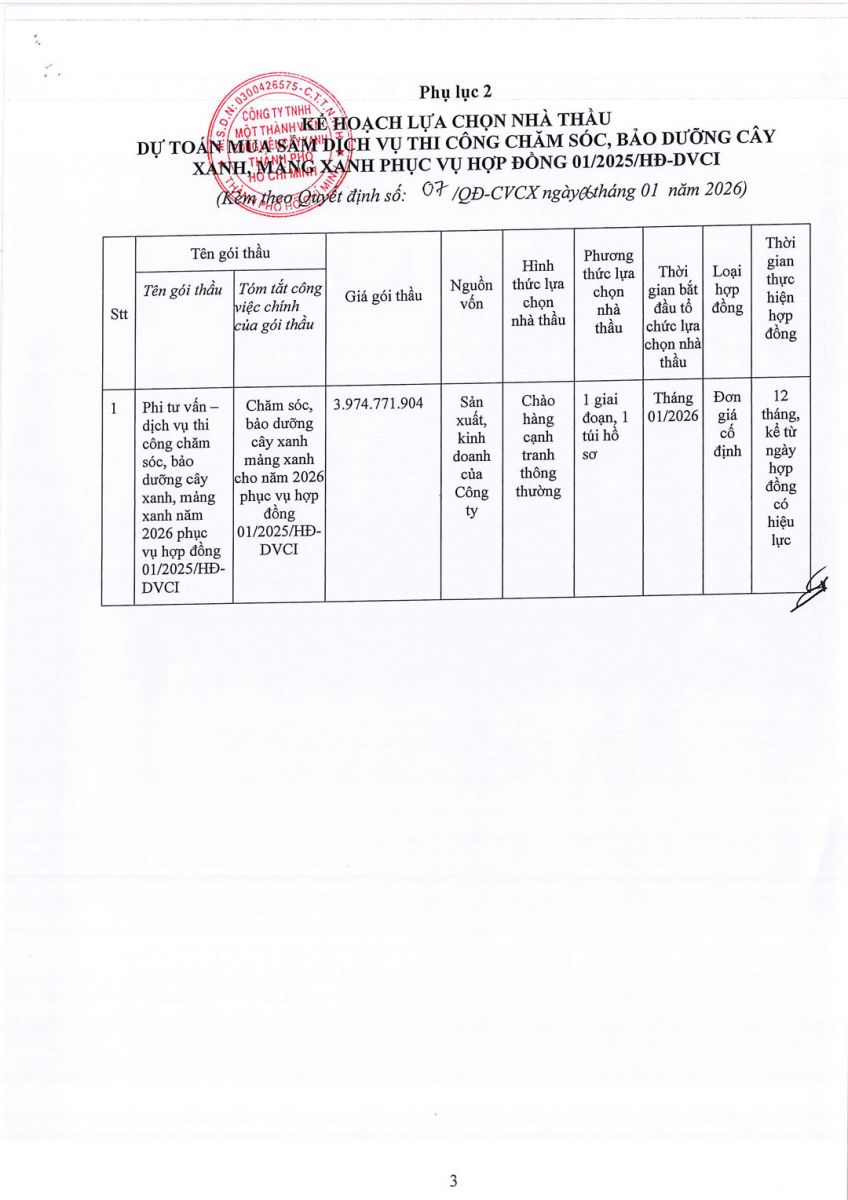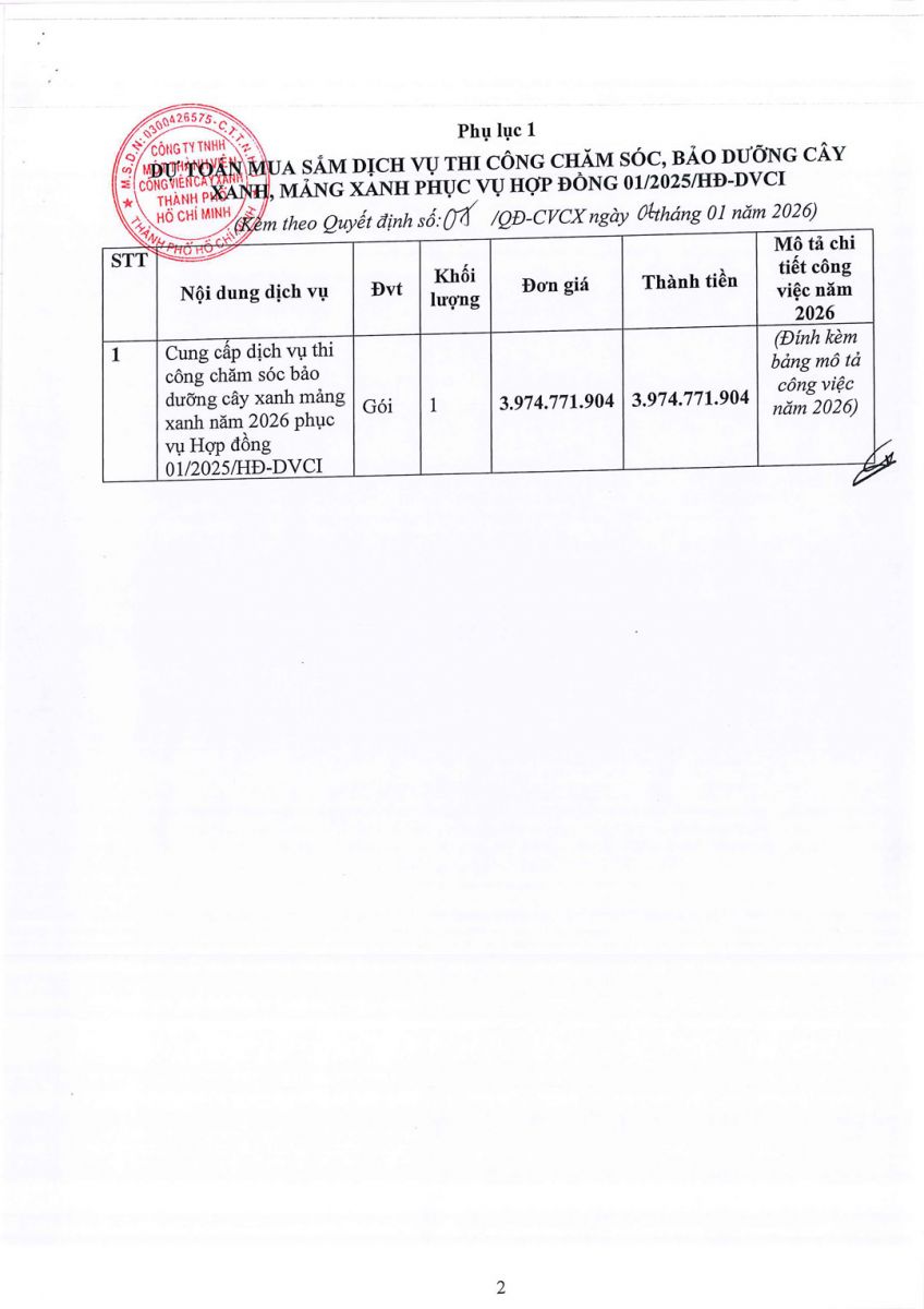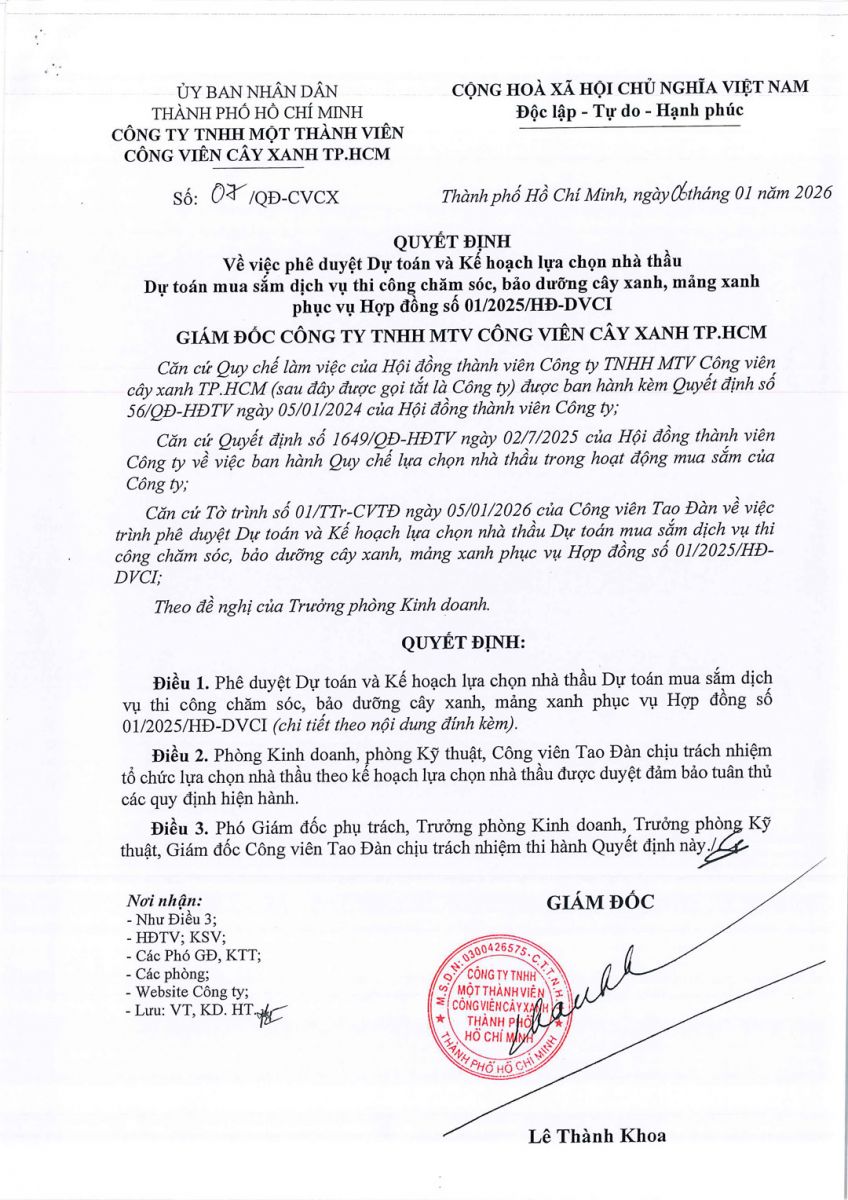 Quyết định về việc phê duyệt Dự toán và Kế hoạch lựa chọn nhà thầu Dự toán mua sắm dịch vụ thi công chăm sóc, bảo dưỡng cây xanh, mảng xanh phục vụ hợp đồng số 01/2025/HĐ-DVCI