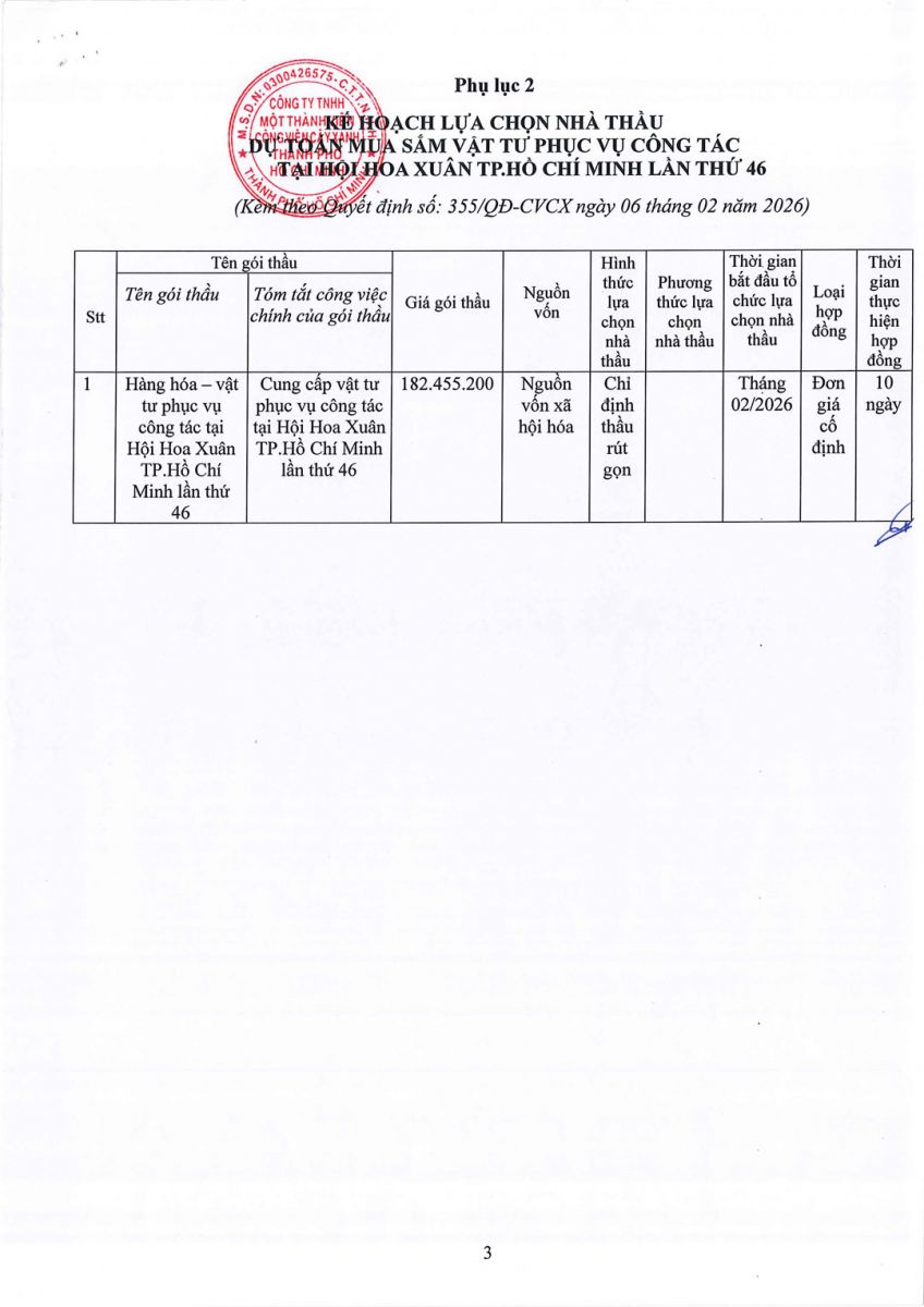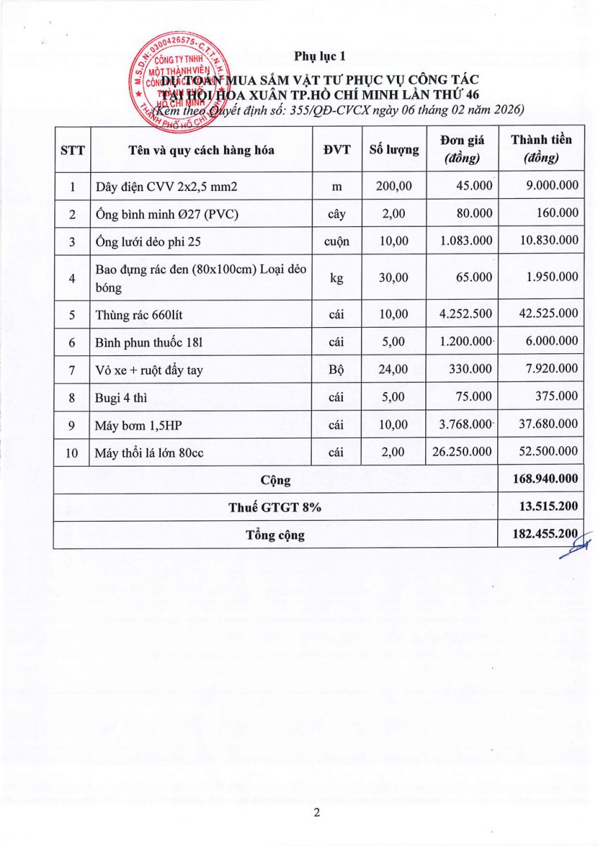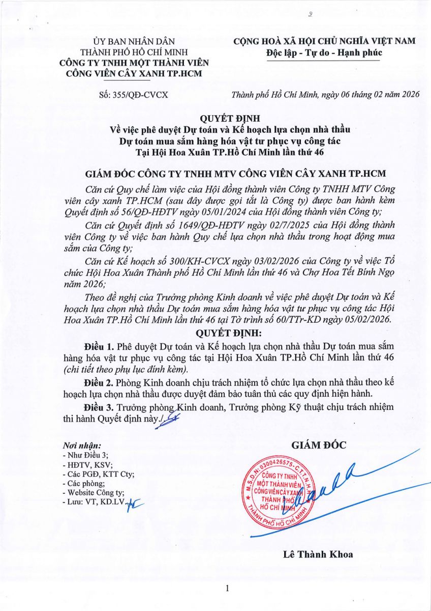 Quyết định về việc phê duyệt Dự toán và Kế hoạch lựa chọn nhà thầu Dự toán mua sắm hàng hóa công cụ dụng cụ phục vụ công tác Tại Hội Hoa Xuân TP.Hồ Chí Minh lần thứ 46