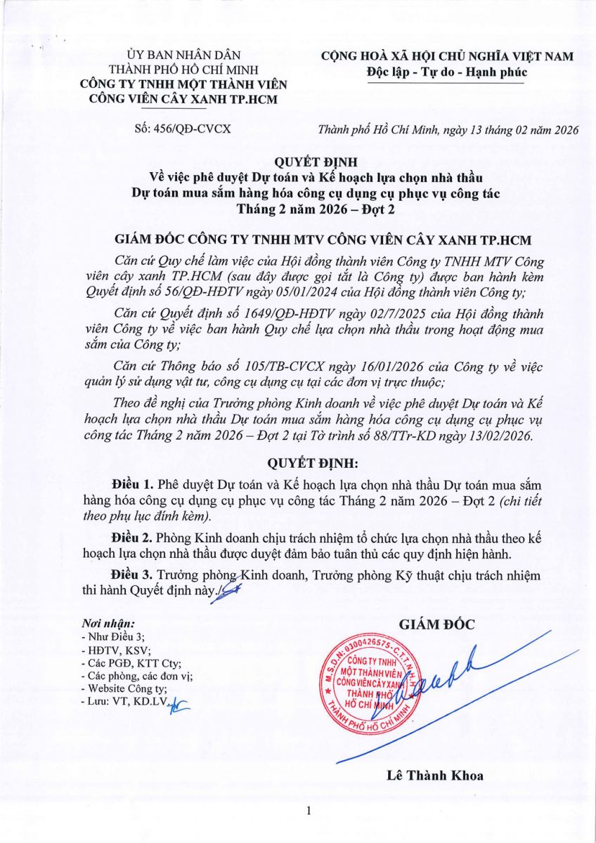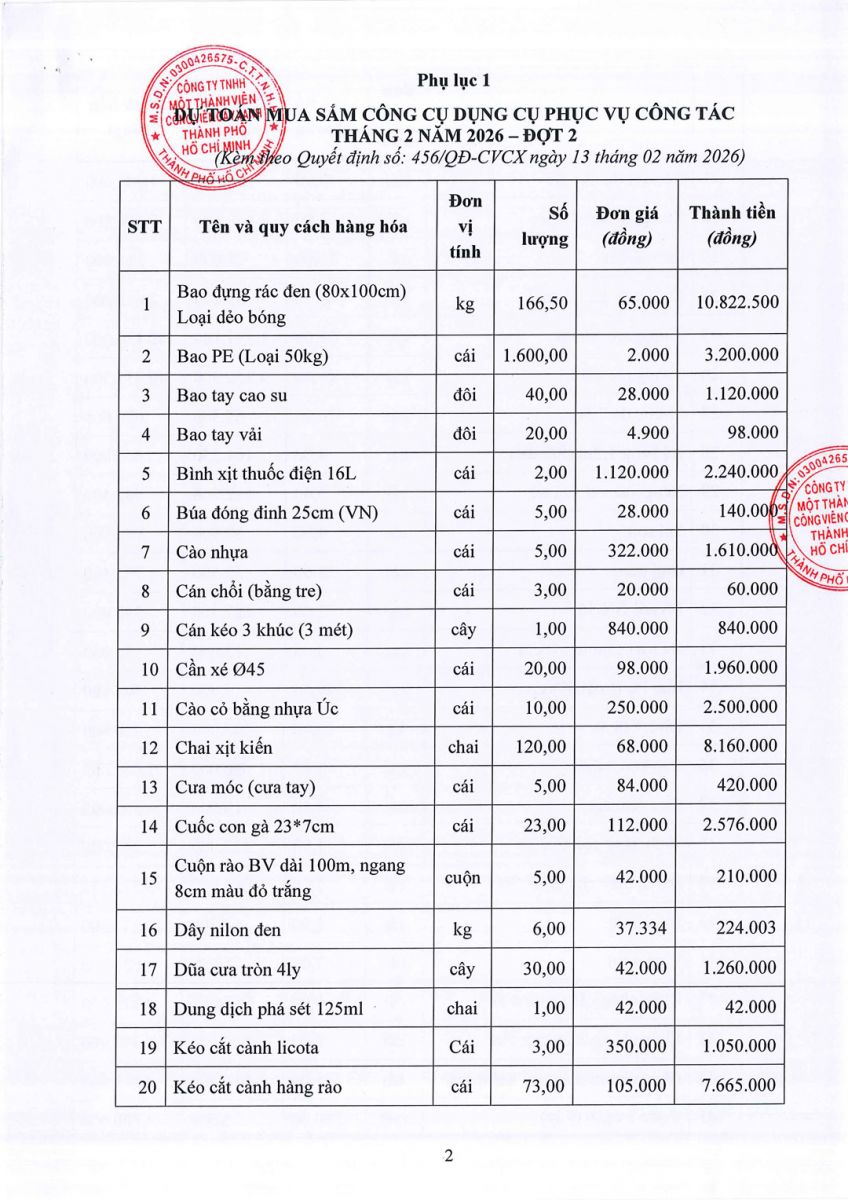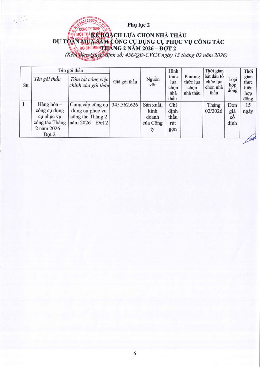 Quyết định về việc phê duyệt Dự toán và Kế hoạch lựa chọn nhà thầu Dự toán mua sắm hàng hóa công cụ dụng cụ phục vụ công tác Tháng 2 năm 2026 – Đợt 2