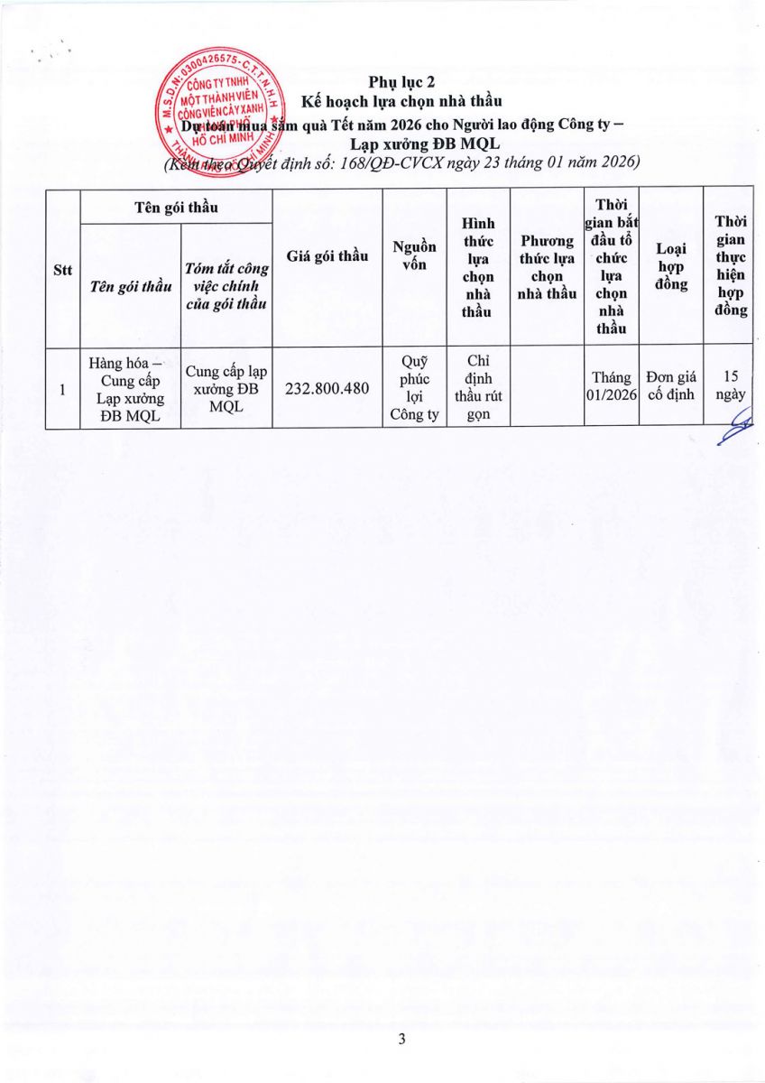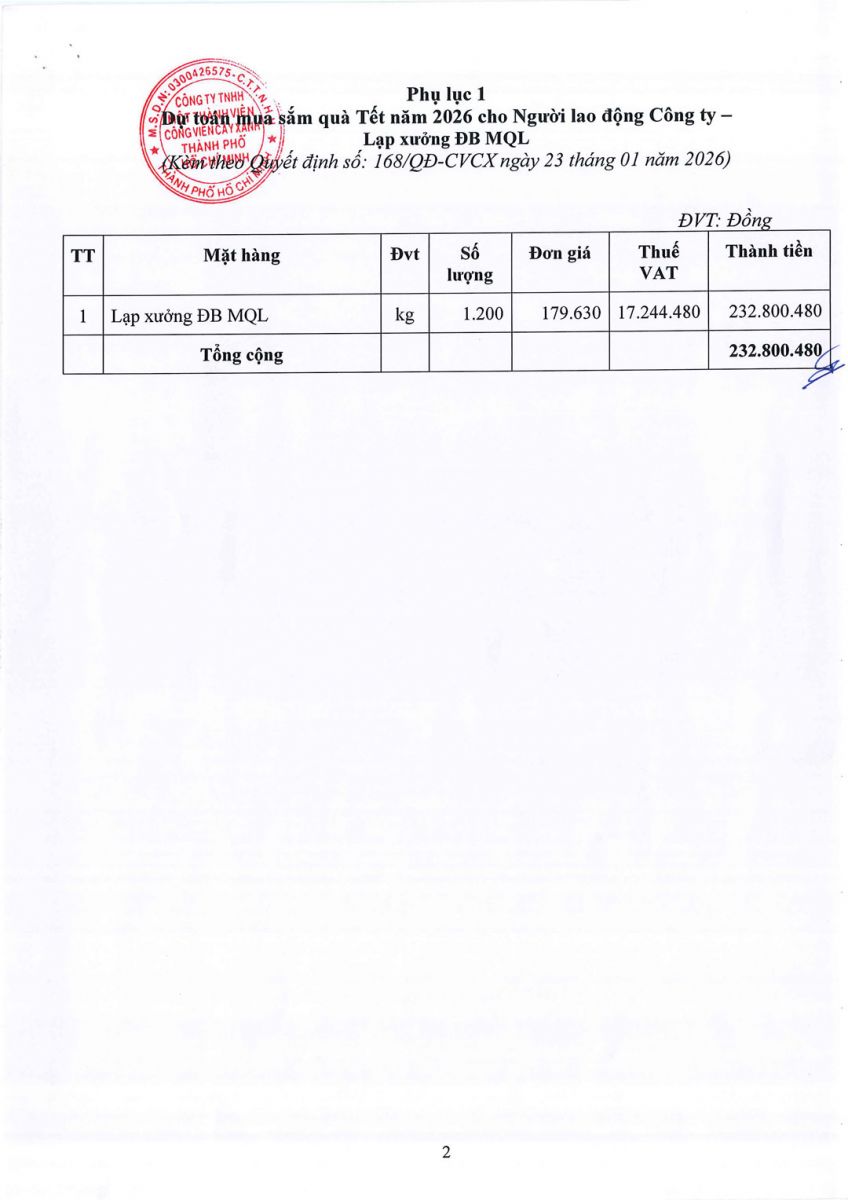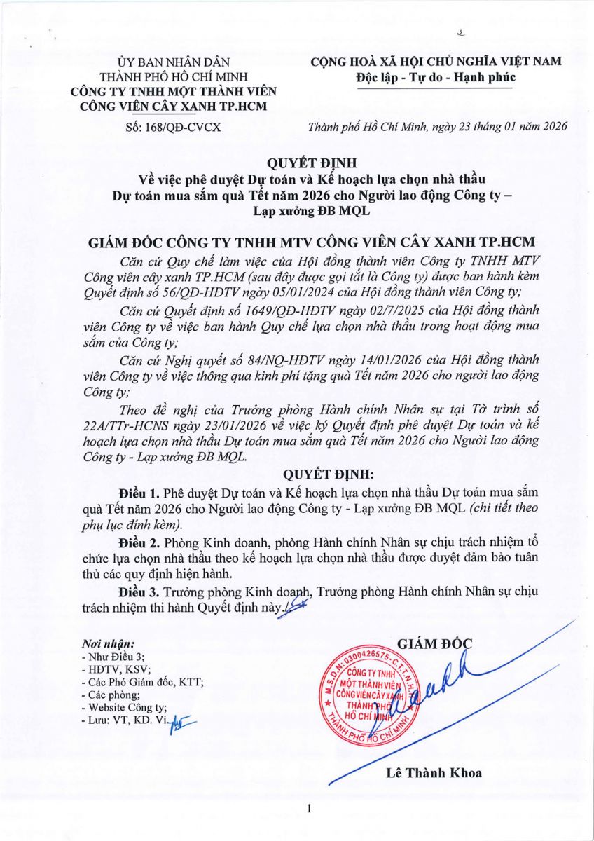 Quyết định về việc phê duyệt dự toán và kế hoạch lựa chọn nhà thầu dự toán mua sắm quà Tết năm 2026 cho Người lao động Công ty – Lạp xưởng ĐB MQL
