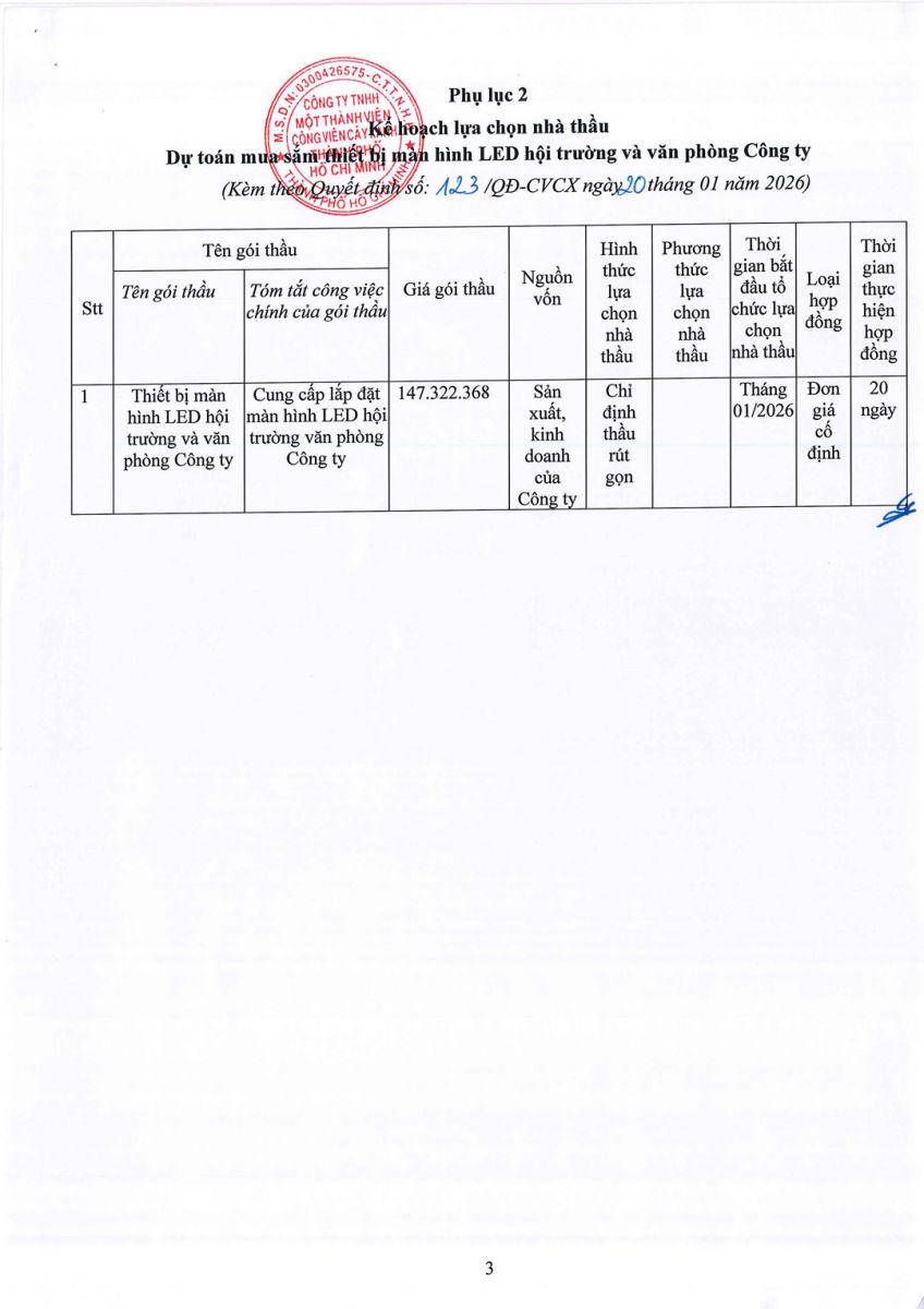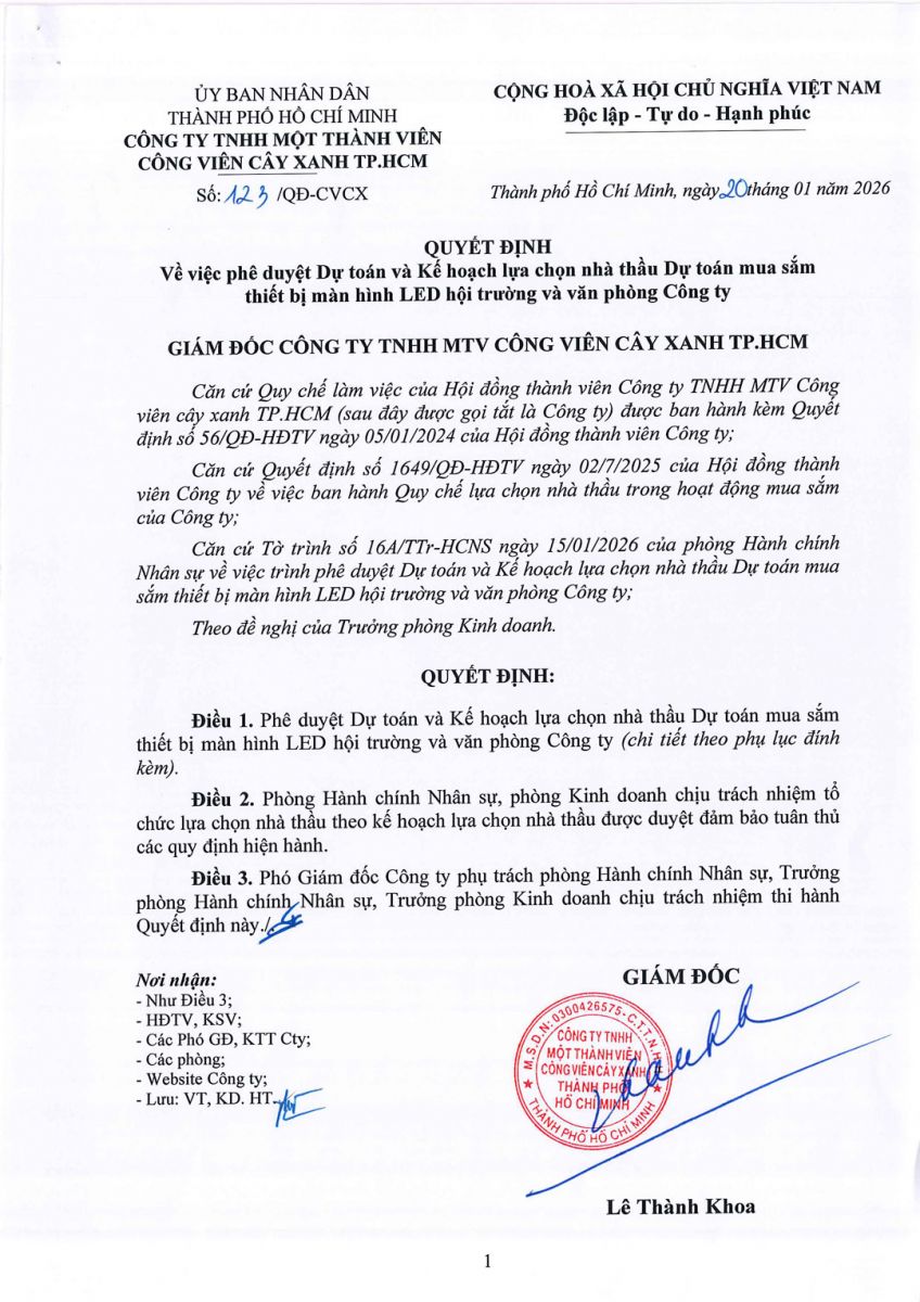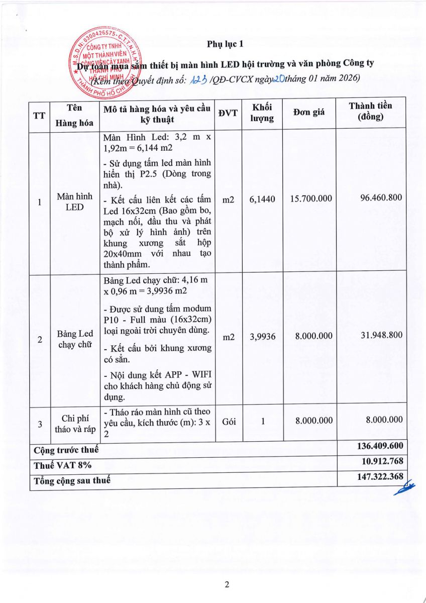 Quyết định về việc phê duyệt dự toán và kế hoạch lựa chọn nhà thầu dự toán mua sắm thiết bị màn hình LED hội trường và văn phòng công ty