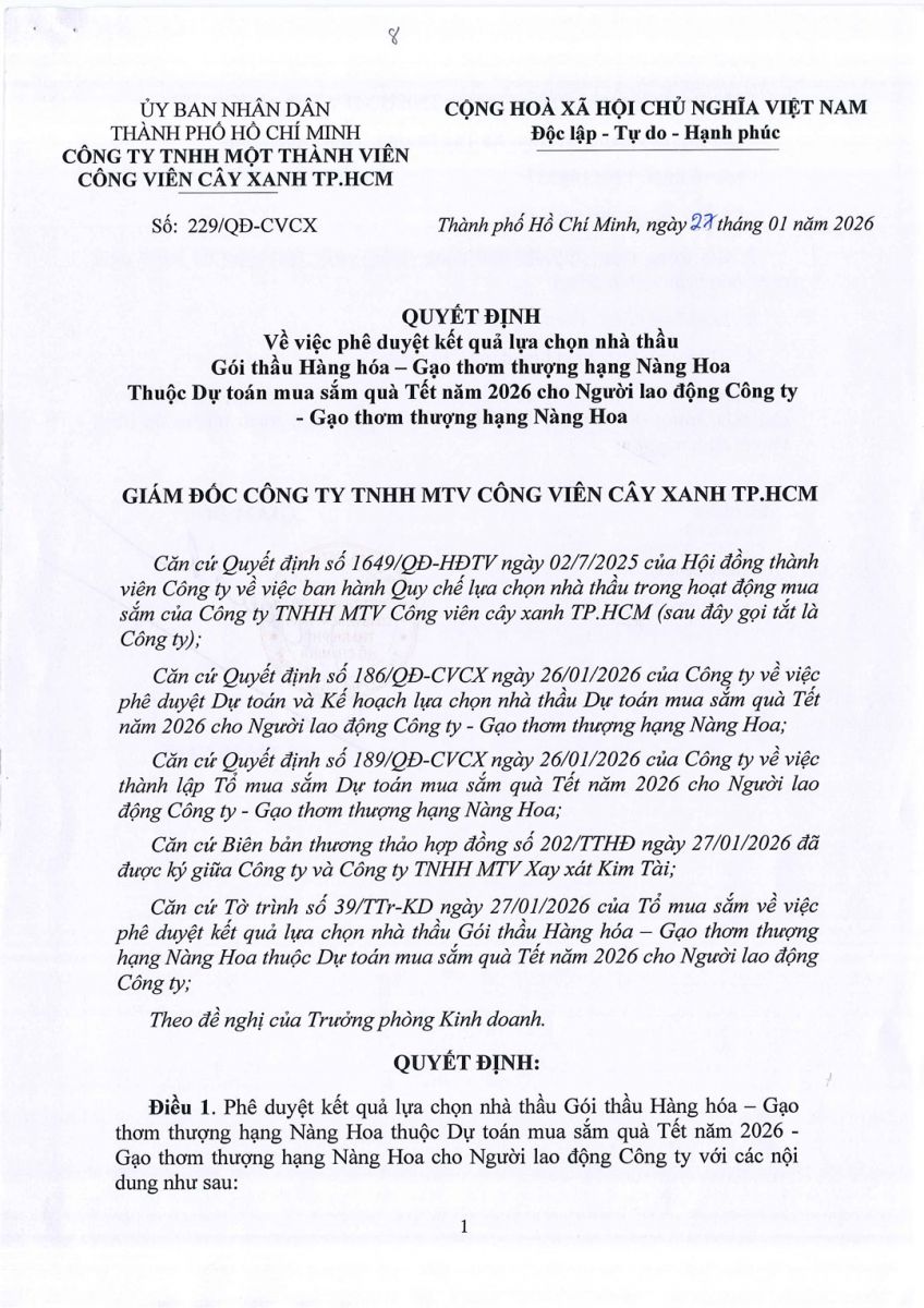 Quyết định về việc phê duyệt kết quả lựa chọn nhà thầu Gói thầu Hàng hóa – Gạo thơm thượng hạng Nàng Hoa