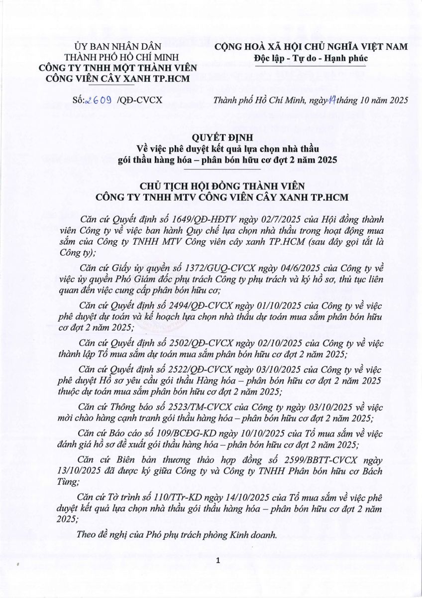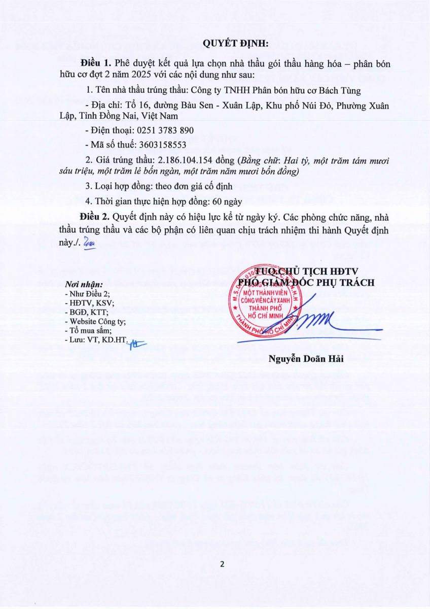 Quyết định về việc phê duyệt kết quả lựa chọn nhà thầu gói thầu hàng hóa - phân bón hữu cơ đợt 2 năm 2025