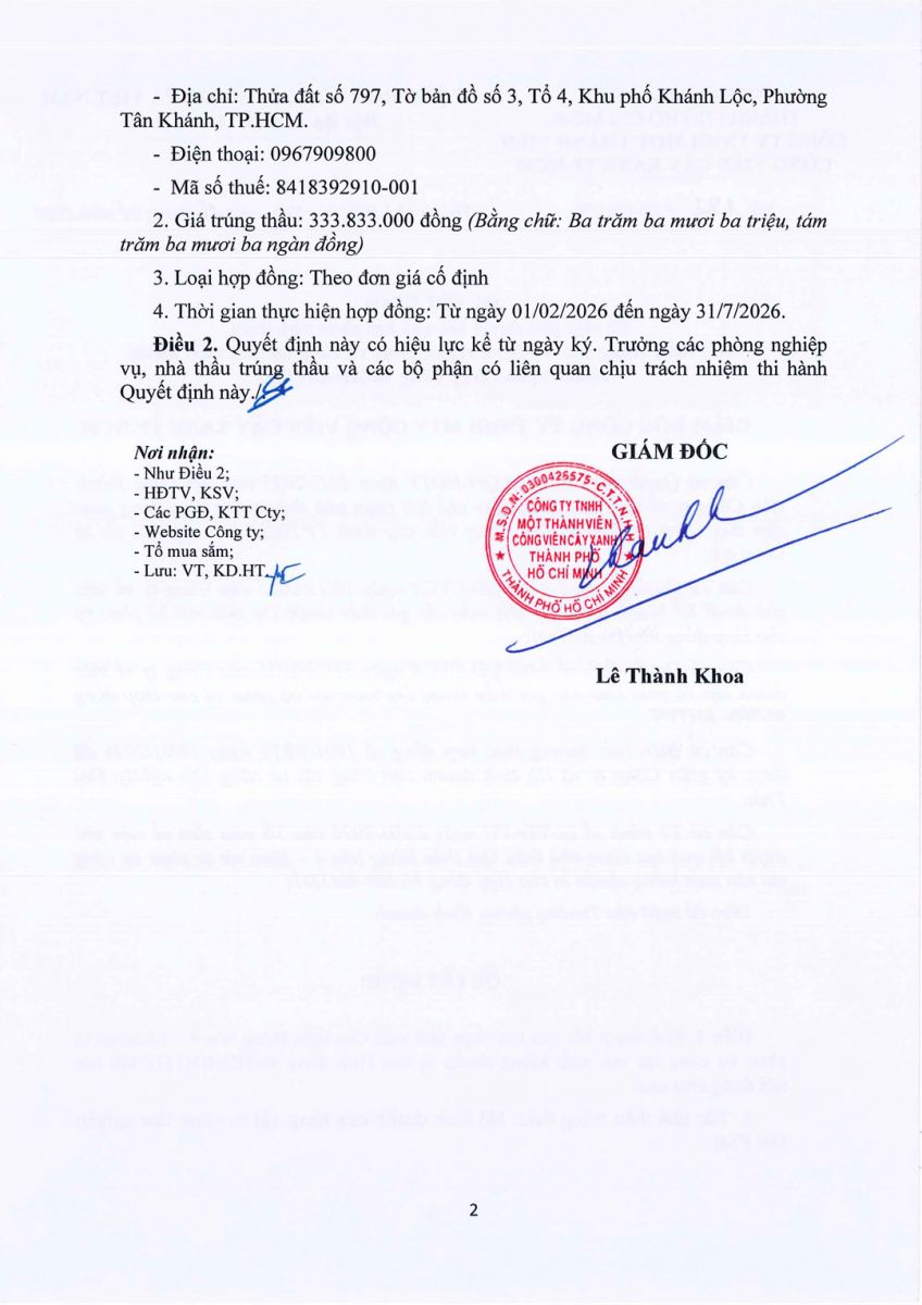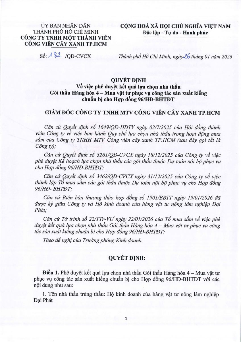Quyết định Về việc phê duyệt kết quả lựa chọn nhà thầu Gói thầu hàng hóa 4 – Mua vật tư phục vụ công tác sản xuất kiểng chuẩn bị cho Hợp đồng 96/HĐ-BHTĐT