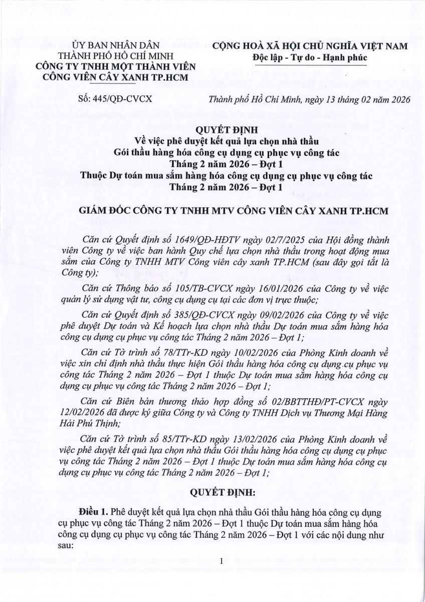 Quyết định về việc phê duyệt kết quả lựa chọn nhà thầu Gói thầu hàng hóa công cụ dụng cụ phục vụ công tác Tháng 2 năm 2026 – Đợt 1