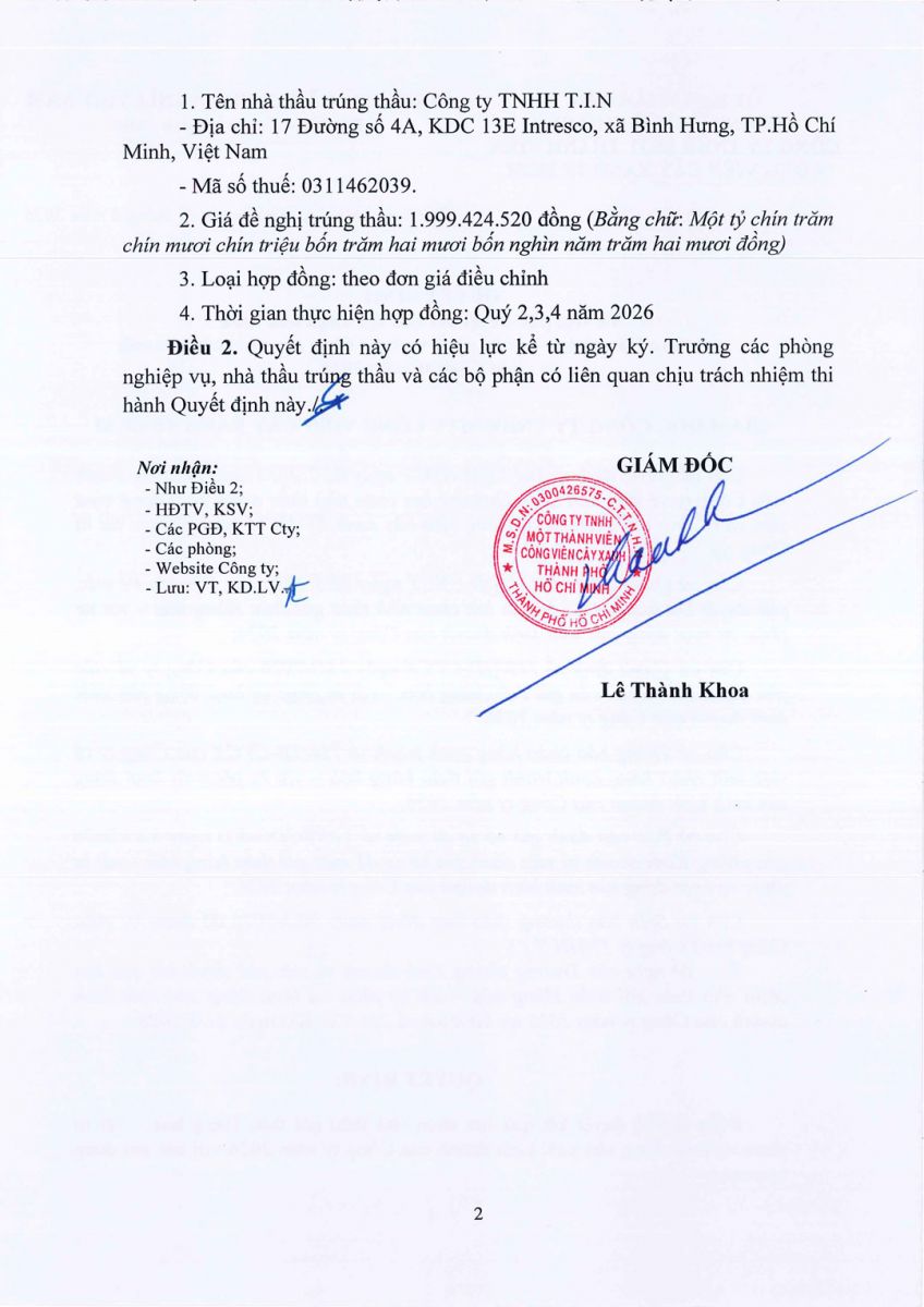 Quyết định Về việc phê duyệt kết quả lựa chọn nhà thầu gói thầu Hàng hóa – vật tư phục vụ hoạt động sản xuất kinh doanh của Công ty năm 2026