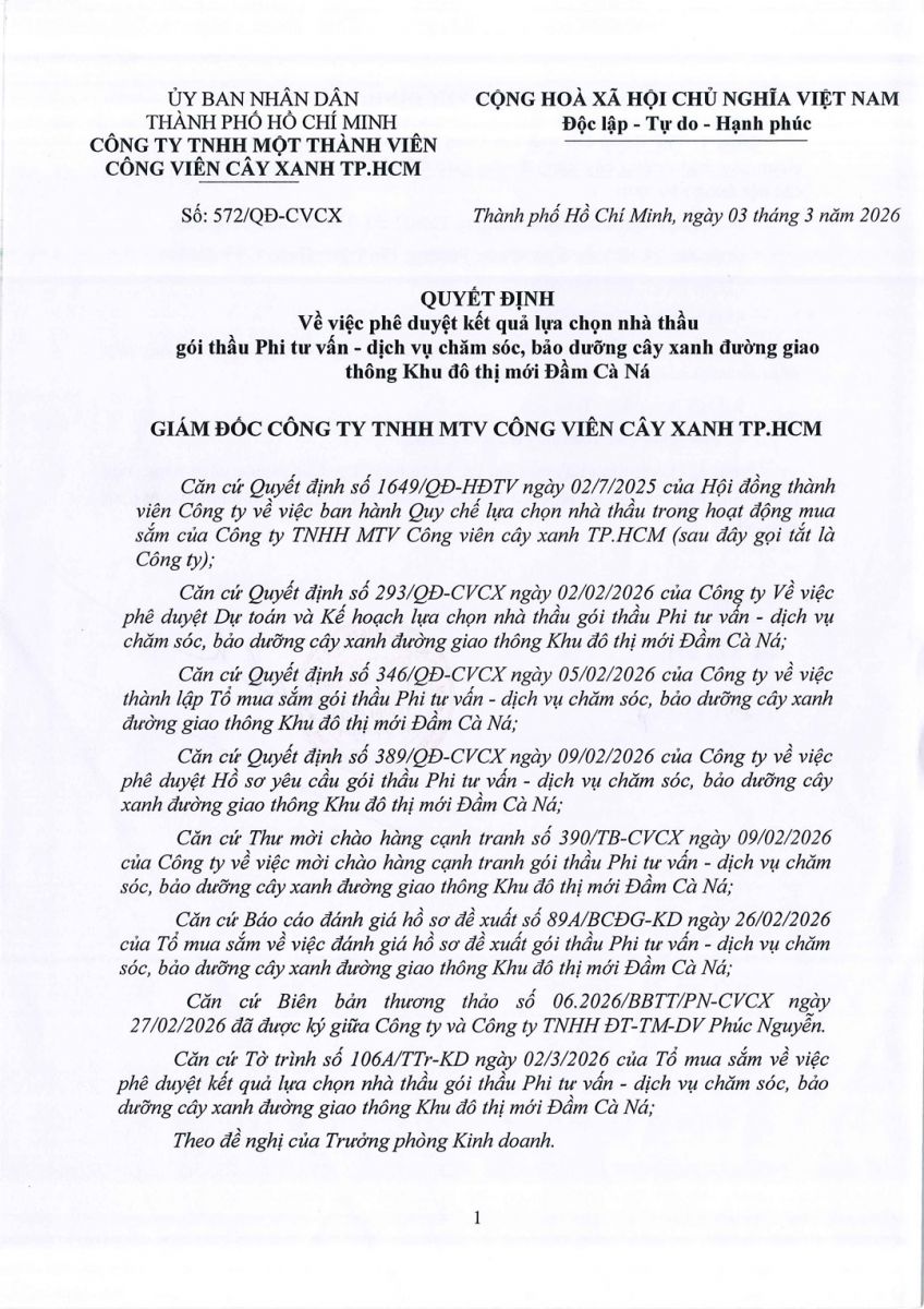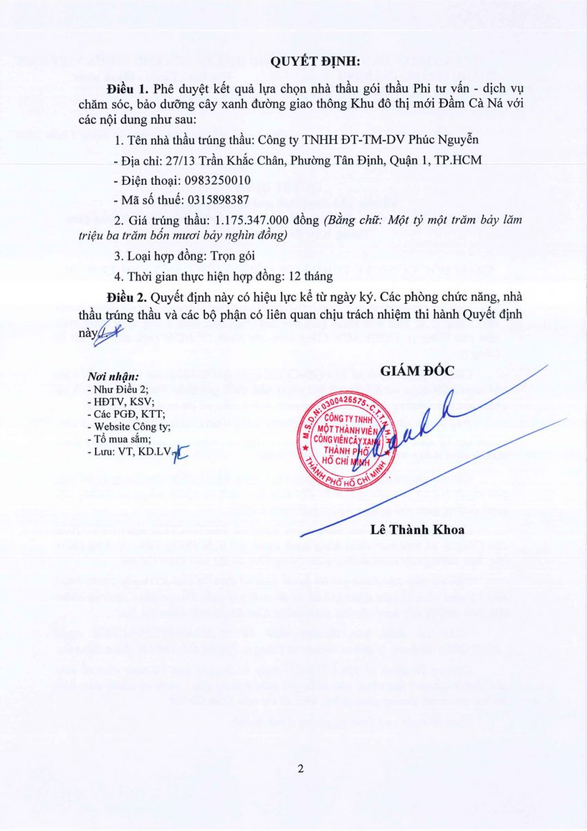 Quyết định Về việc phê duyệt kết quả lựa chọn nhà thầu gói thầu Phi tư vấn - dịch vụ chăm sóc, bảo dưỡng cây xanh đường giao thông Khu đô thị mới Đầm Cà Ná