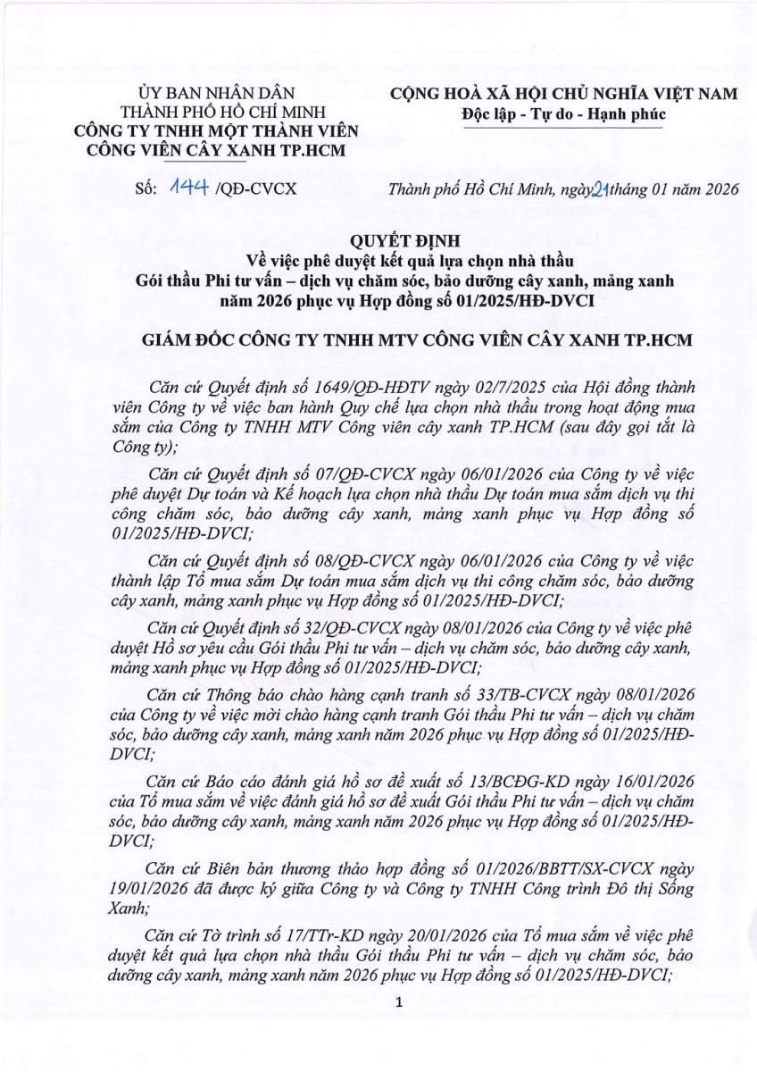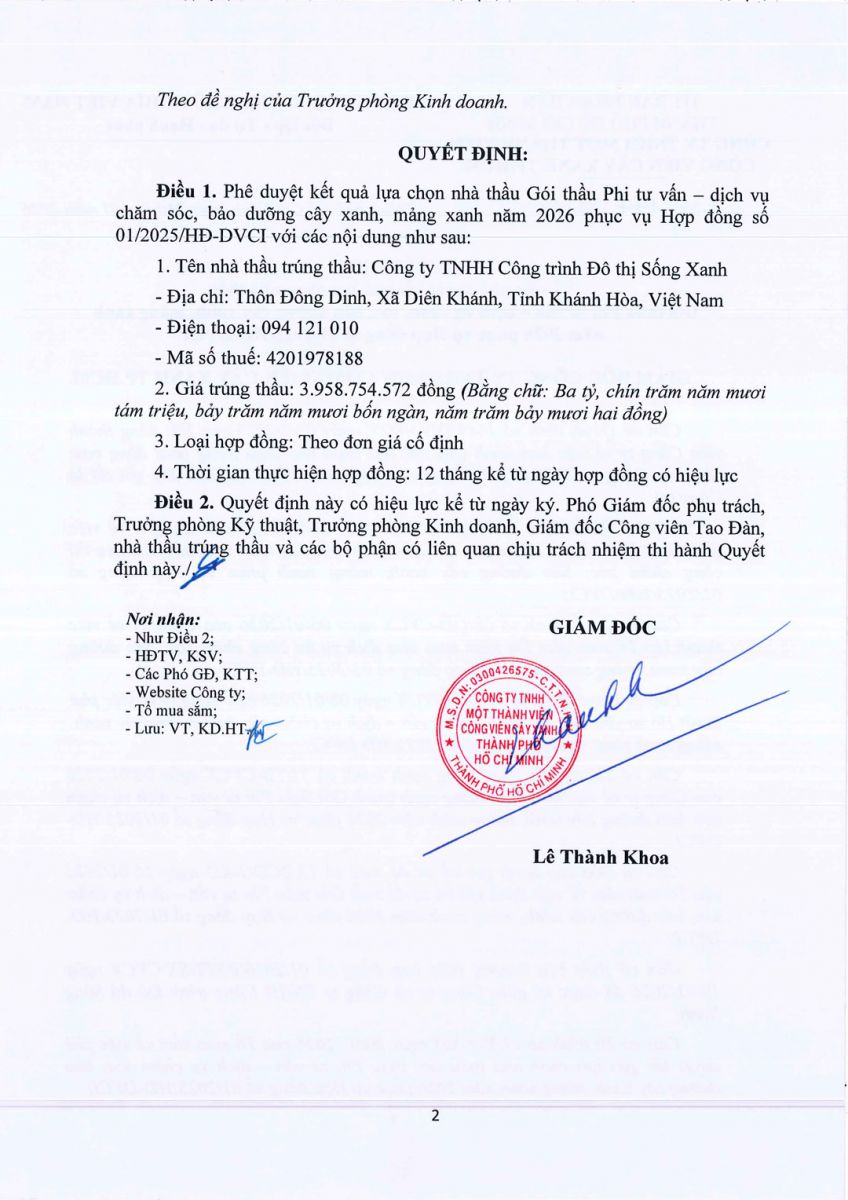 Quyết định về việc phê duyệt kết quả lựa chọn nhà thầu gói thầu phi tư vấn - dịch vụ chăm sóc, bảo dưỡng cây xanh, mảng xanh năm 2026 phục vụ hợp đồng số 01/2025/HĐ-DVCI
