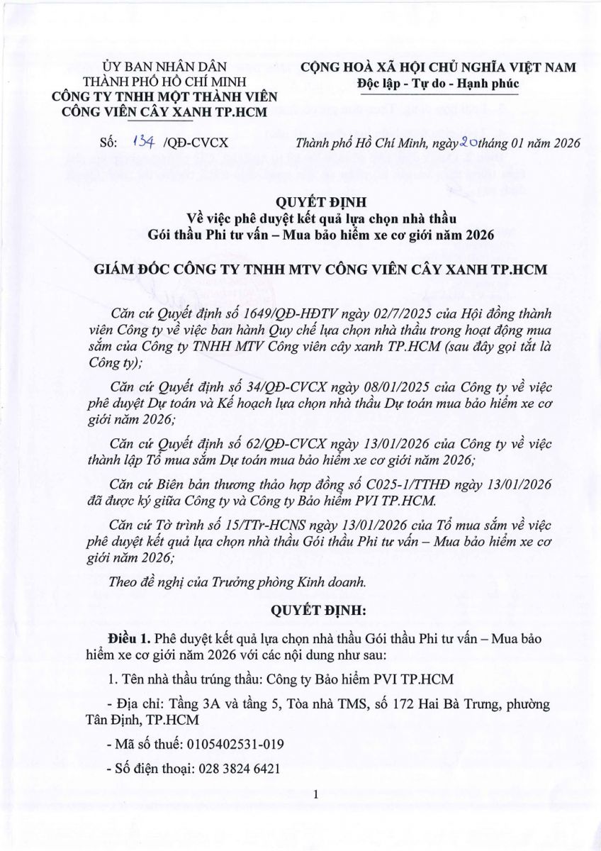 Quyết định về việc phê duyệt kết quả lựa chọn nhà thầu Gói thầu phi tư vấn – mu bảo hiểm xe cơ giới năm 2026