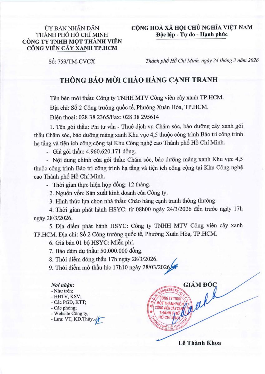Thống báo mời chào hàng cạnh tranh số 759/TM-CVCX ngày 24 tháng 3 năm 2026 về việc mời thầu thực hiện gói thầu: Phi tư vấn - Thuê dịch vụ Chăm sóc, bảo dưỡng cây xanh gói thầu Chăm sóc, bảo dưỡng mảng xanh Khu vực 4,5 thuộc công trình Bảo trì công trình hạ tầng và tiện ích công cộng tại Khu Công nghệ cao Thành phố Hồ Chí Minh