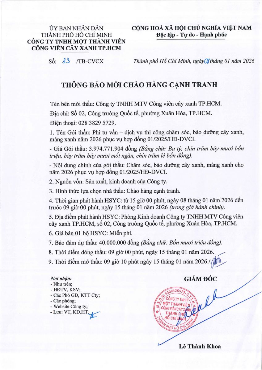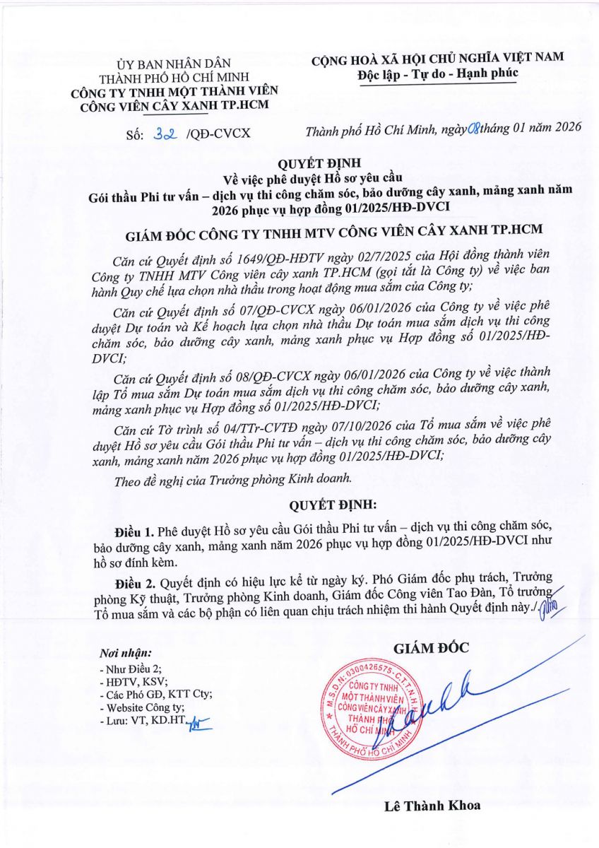 Quyết định số 833/QĐ-CVCX ngày 31 tháng 3 năm 2026 về việc phê duyệt kết quả lựa chọn nhà thầu gói thầu Phi tư vấn - Thuê dịch vụ Chăm sóc, bảo dưỡng cây xanh gói thầu Chăm sóc, bảo dưỡng mảng xanh Khu vực 4,5 thuộc công trình Bảo trì công trình hạ tầng và tiện ích công cộng tại Khu Công nghệ cao Thành phố Hồ Chí Minh