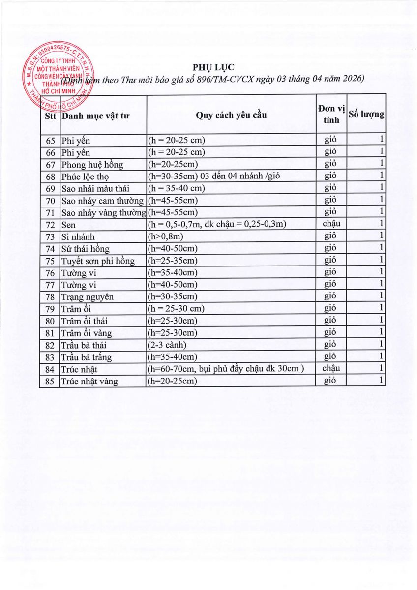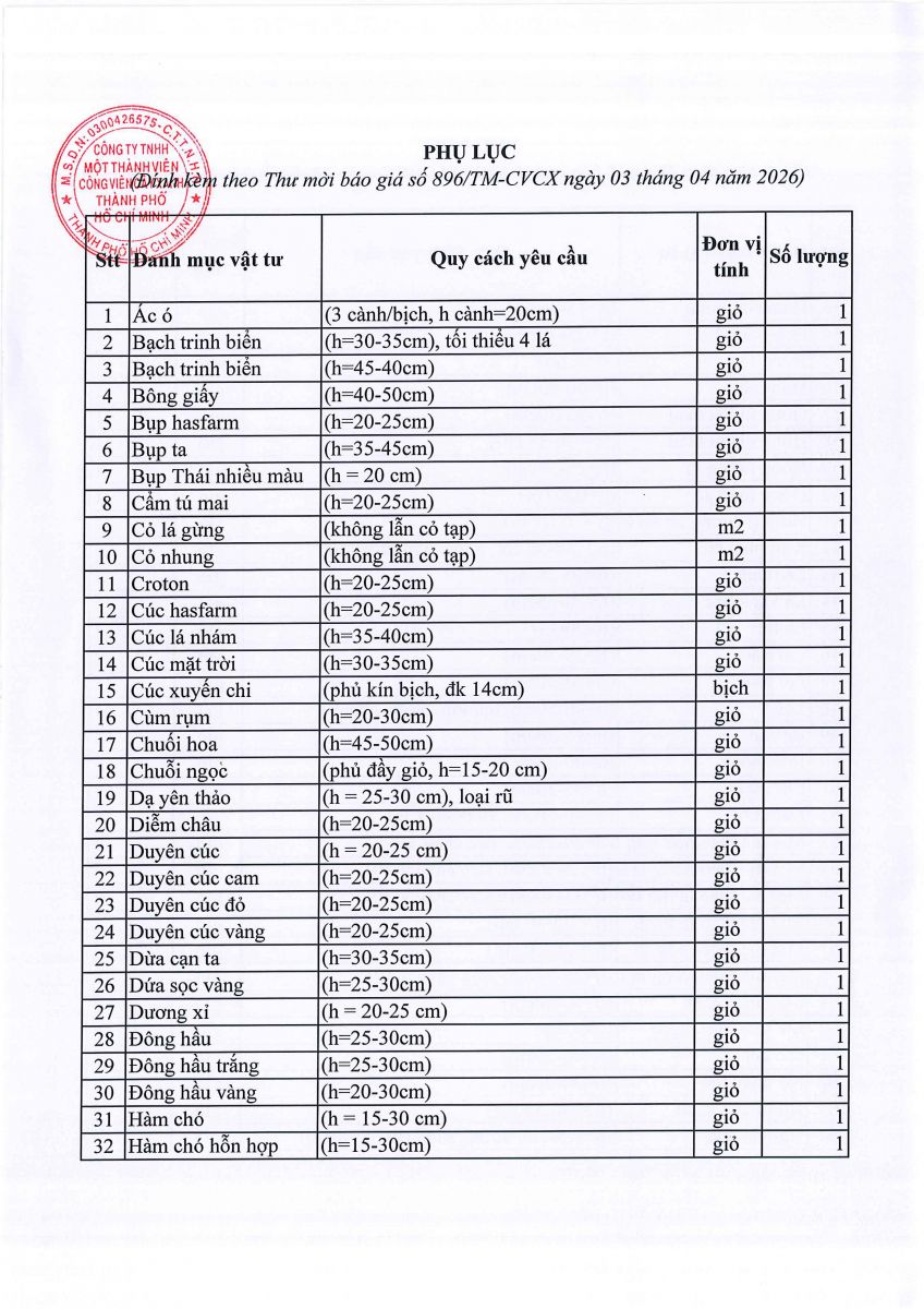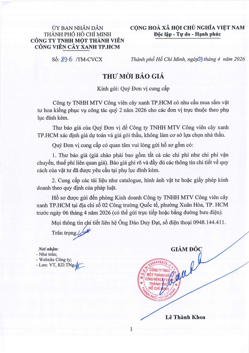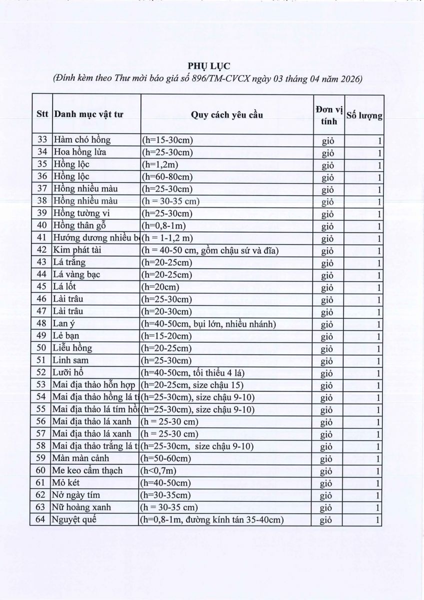Thư mời báo giá vật tư hoa kiểng phục vụ công tác Quý 2 năm 2026