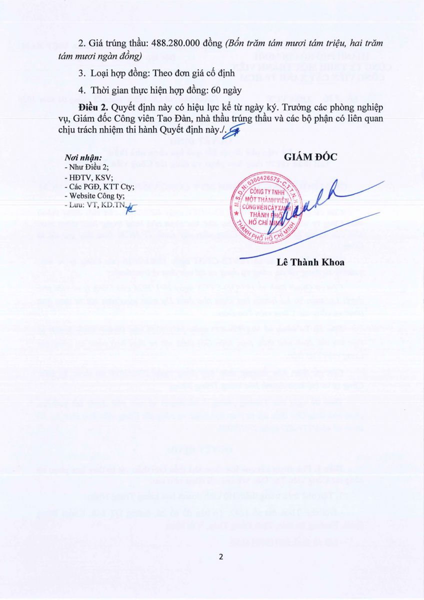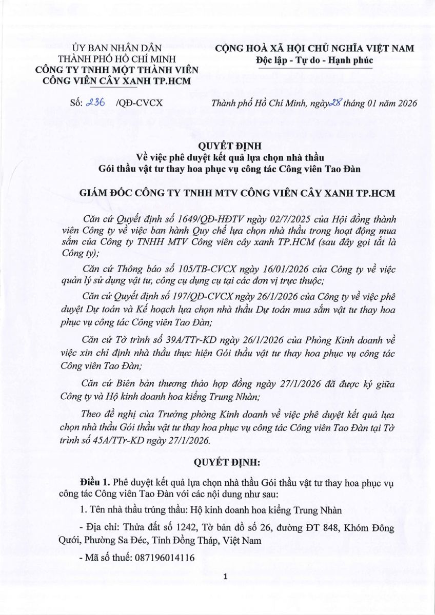 Quyết định số 236/QĐ-CVCX ngày 28/01/2026 của Công ty về việc phê duyệt kết quả lựa chọn nhà thầu Gói thầu vật tư thay hoa phục vụ công tác Công viên Tao Đàn