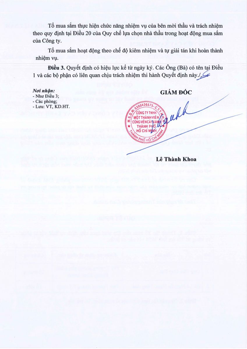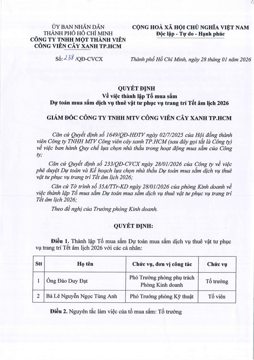 Quyết định số 238/QĐ-CVCX ngày 28/01/2026 của Công ty về việc thành lập Tổ mua sắm Dự toán mua sắm dịch vụ thuê vật tư trang trí Tết âm lịch 2026 phục vụ công tác của Công viên Trung Tâm
