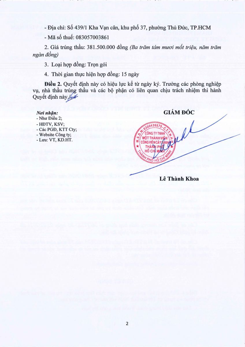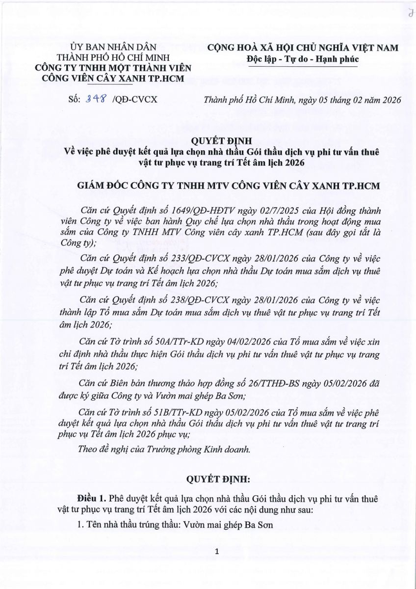 Quyết định số 348/QĐ-CVCX ngày 05/02/2026 của Công ty về việc phê duyệt kết quả lựa chọn nhà thầu Gói thầu dịch vụ thuê vật tư thuê vật tư trang trí Tết âm lịch 2026 phục vụ công tác của Công viên Trung Tâm
