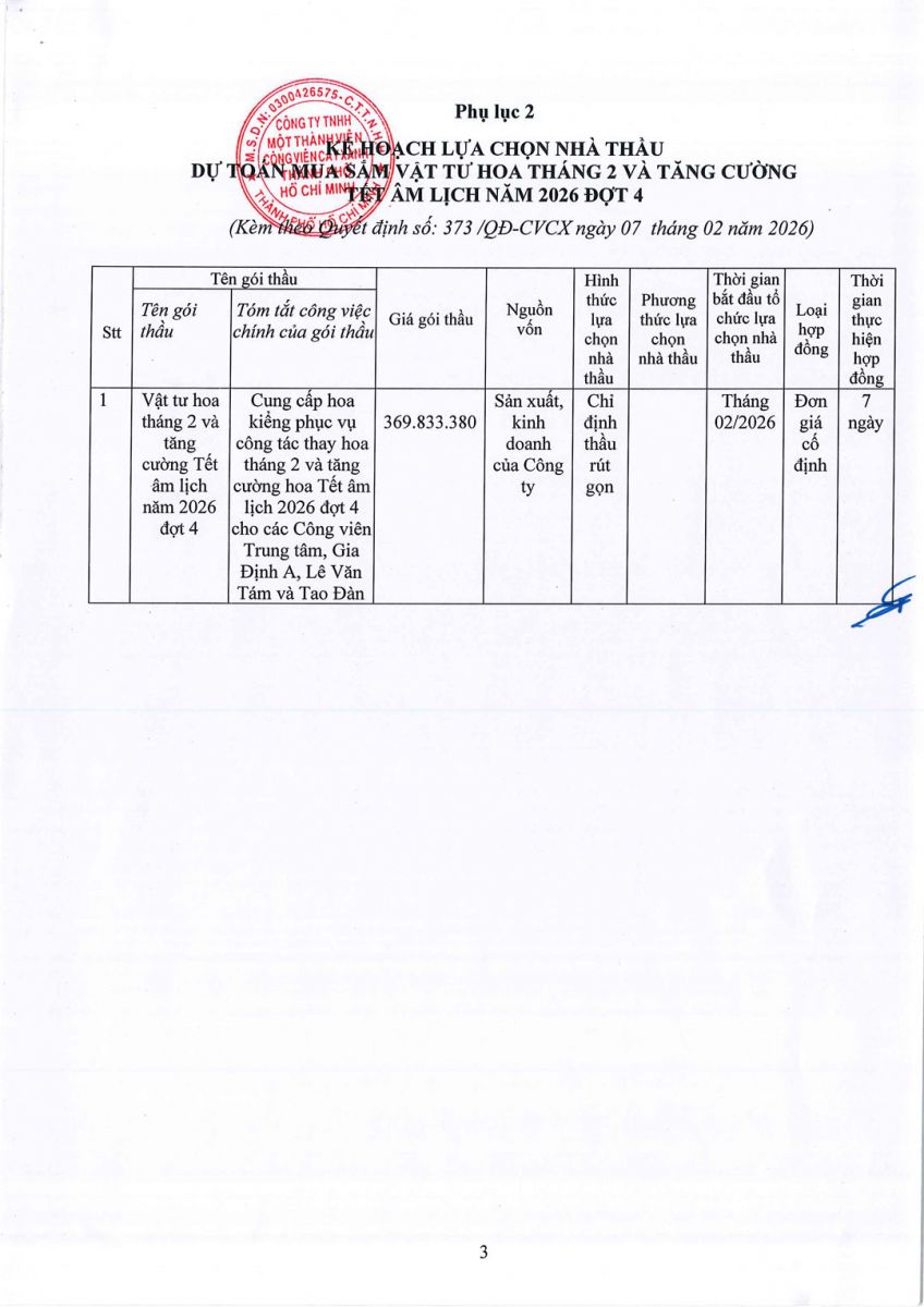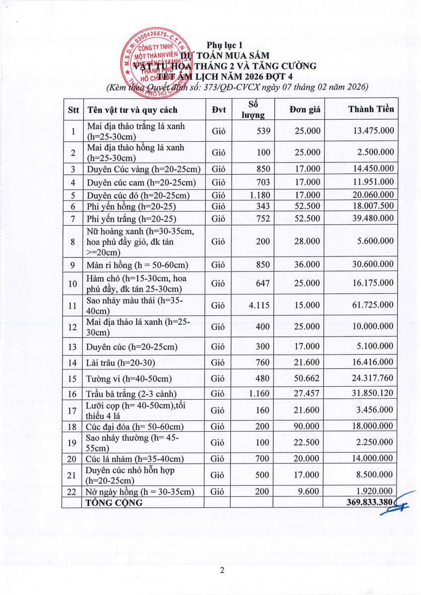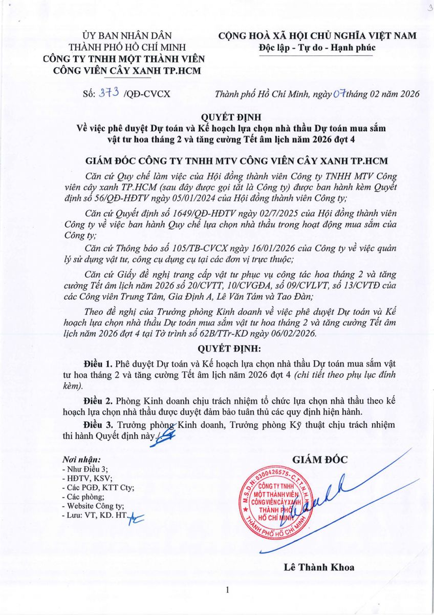 Quyết định số 373/QĐ-CVCX ngày 07/02/2026 của Công ty về việc phê duyệt Dự toán và Kế hoạch lựa chọn nhà thầu Dự toán mua sắm vật tư hoa tháng và tăng cường Tết âm lịch năm 2026 đợt 4