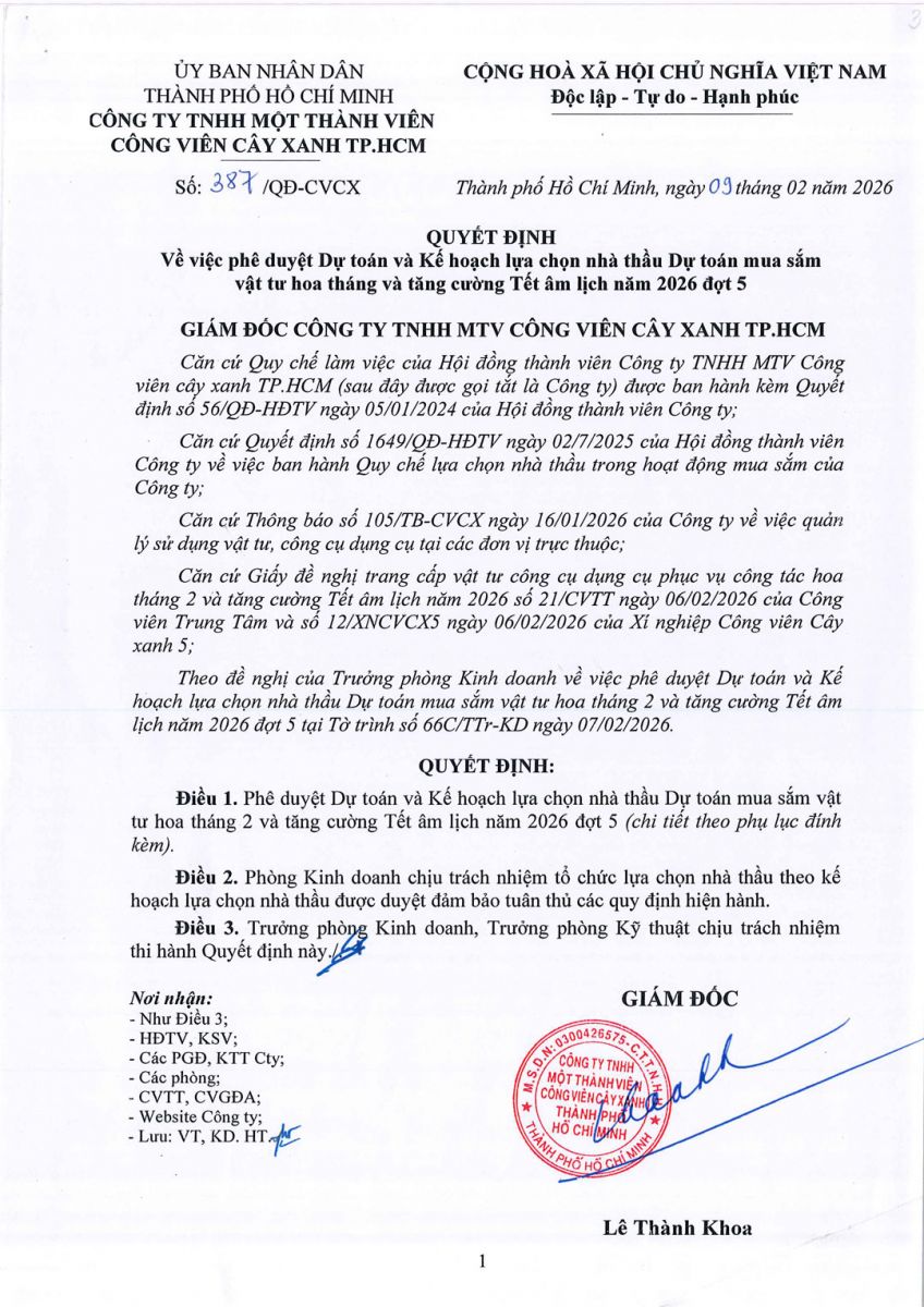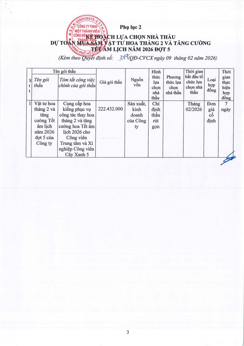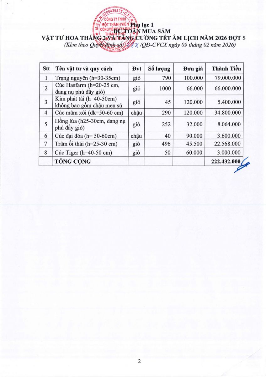 Quyết định số 387/QĐ-CVCX ngày 09/02/2026 của Công ty về việc phê duyệt Dự toán và Kế hoạch lựa chọn nhà thầu Dự toán mua sắm vật tư hoa tháng 2 và tăng cường Tết âm lịch năm 2026 đợt 5