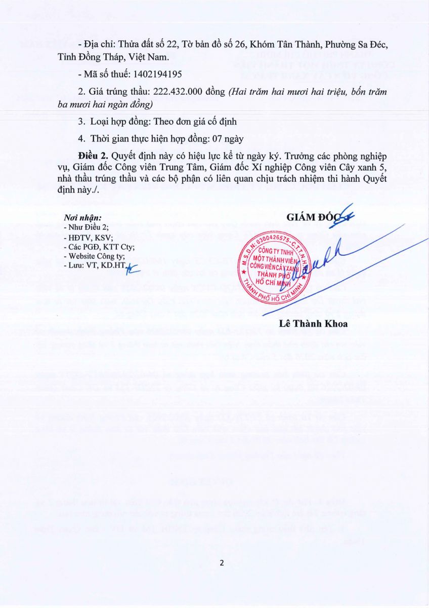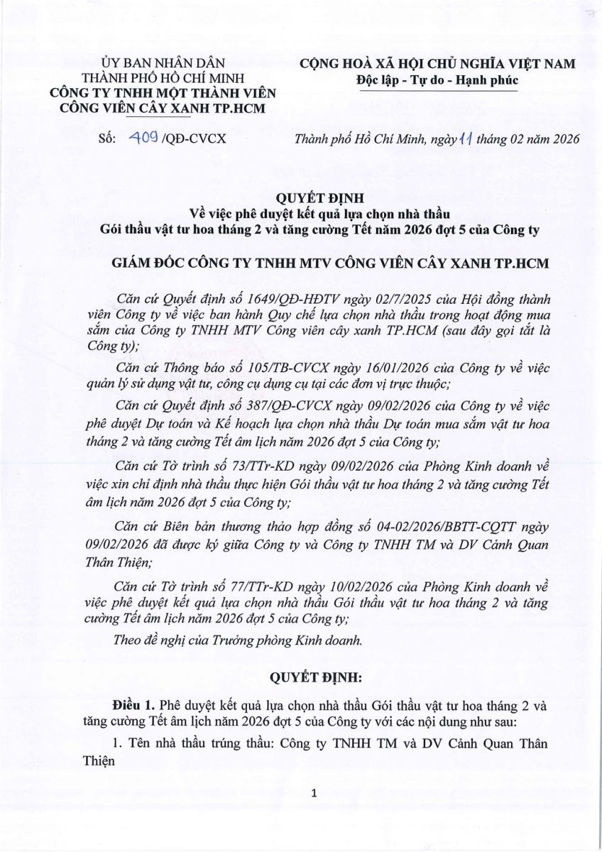 Quyết định số 409/QĐ-CVCX ngày 11/02/2026 của Công ty về việc phê duyệt kết quả lựa chọn nhà thầu Gói thầu vật tư hoa tháng 2 và tăng cường Tết âm lịch năm 2026 đợt 5 của Công ty
