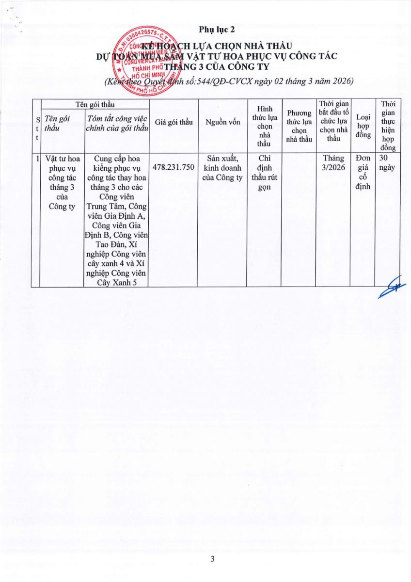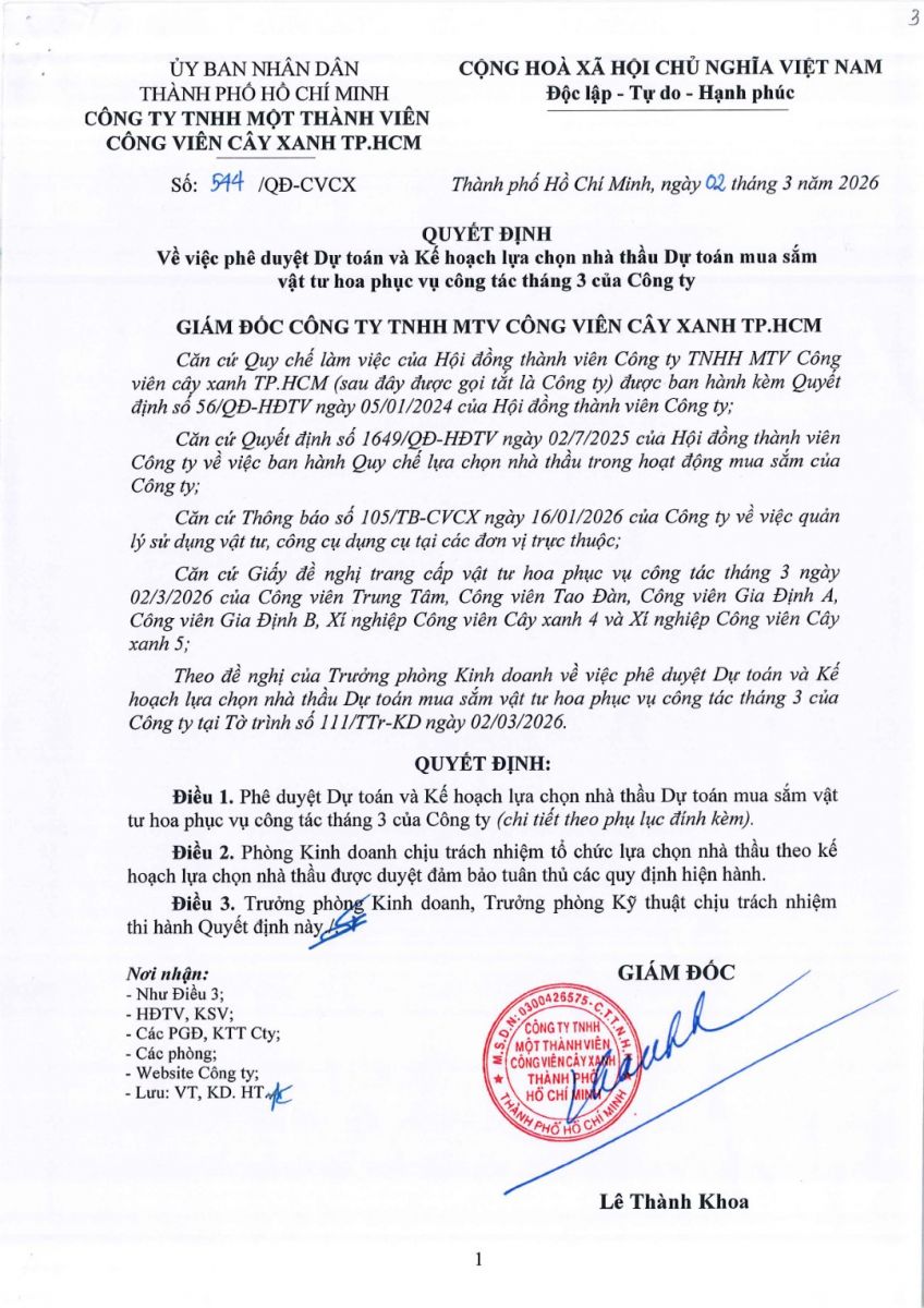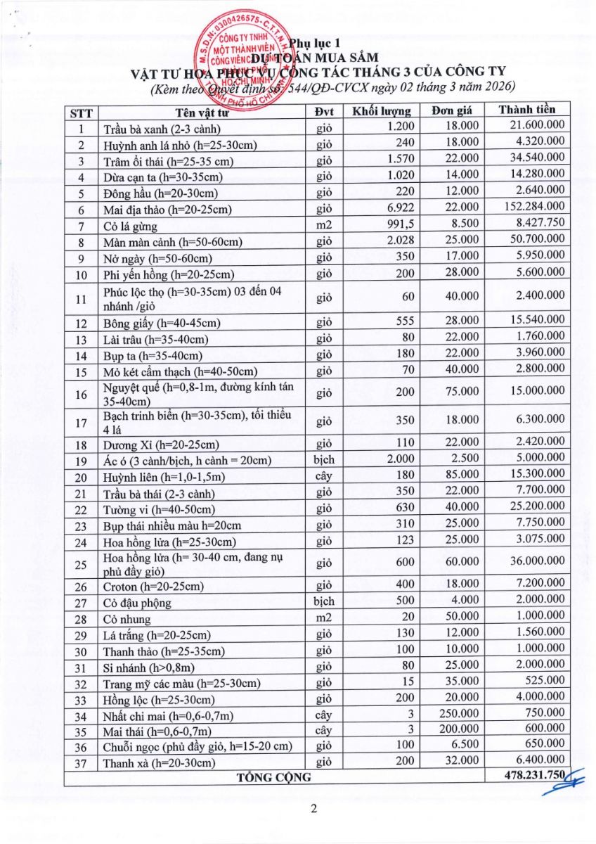 Quyết định số 544/QĐ-CVCX ngày 02/03/2026 của Công ty về việc phê duyệt Dự toán và Kế hoạch lựa chọn nhà thầu Dự toán mua sắm vật tư hoa phục vụ công tác tháng 3 của Công ty