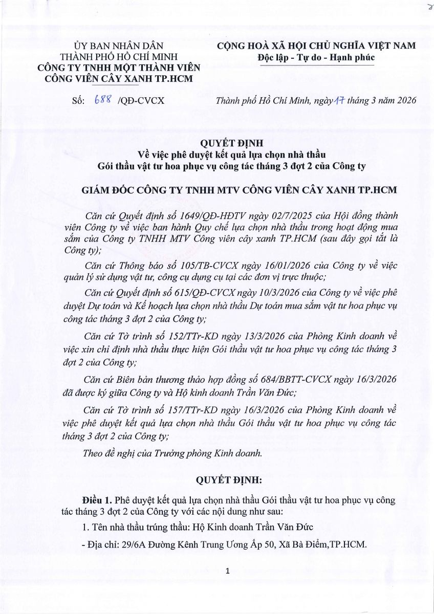 Quyết định số 688/QĐ-CVCX ngày 17/3/2026 của Công ty về việc phê duyệt kết quả lựa chọn nhà thầu Gói thầu vật tư hoa phục vụ công tác tháng 3 đợt 2 của Công ty