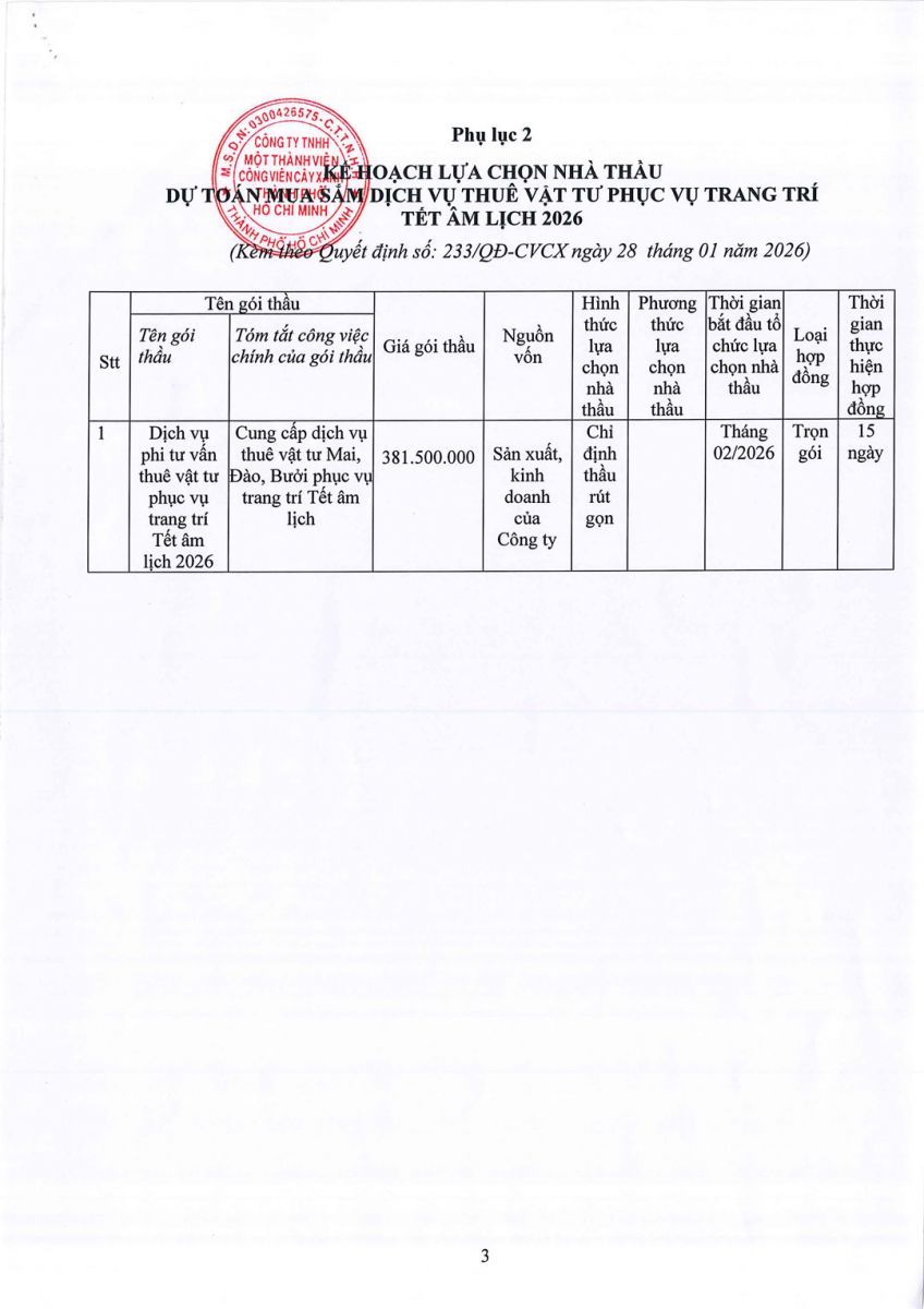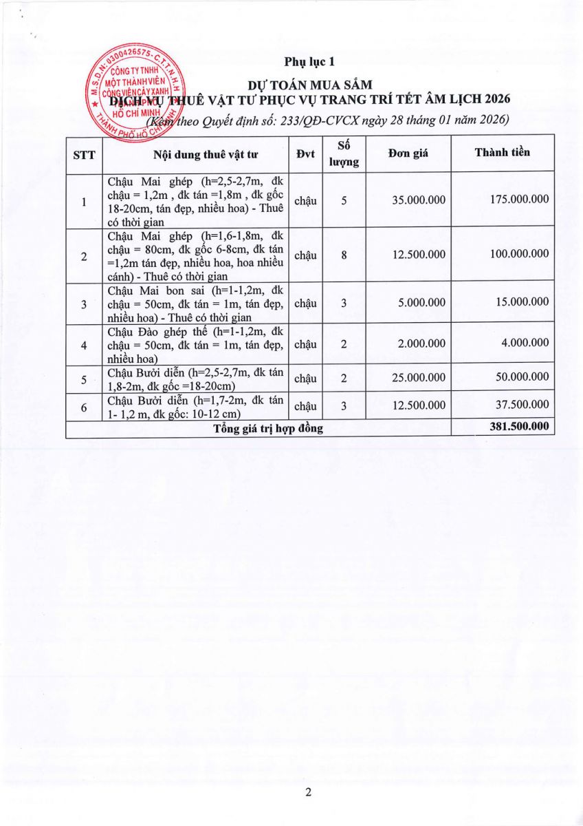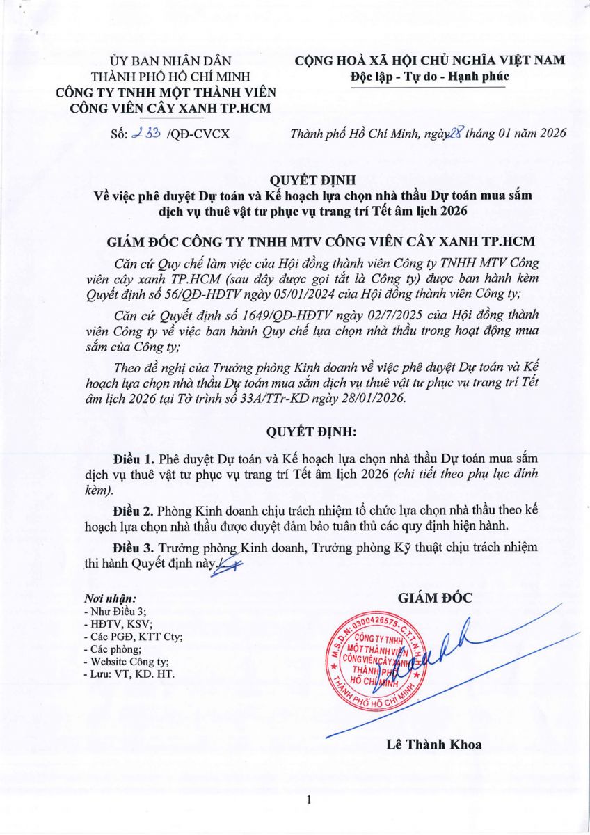 Quyết định về việc phê duyệt Dự toán và Kế hoạch lựa chọn nhà thầu Dự toán mua sắm dịch vụ thuê vật tư trang trí Tết âm lịch 2026 phục vụ công tác của Công viên Trung Tâm