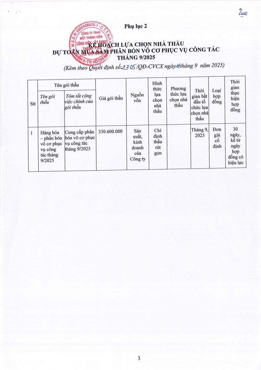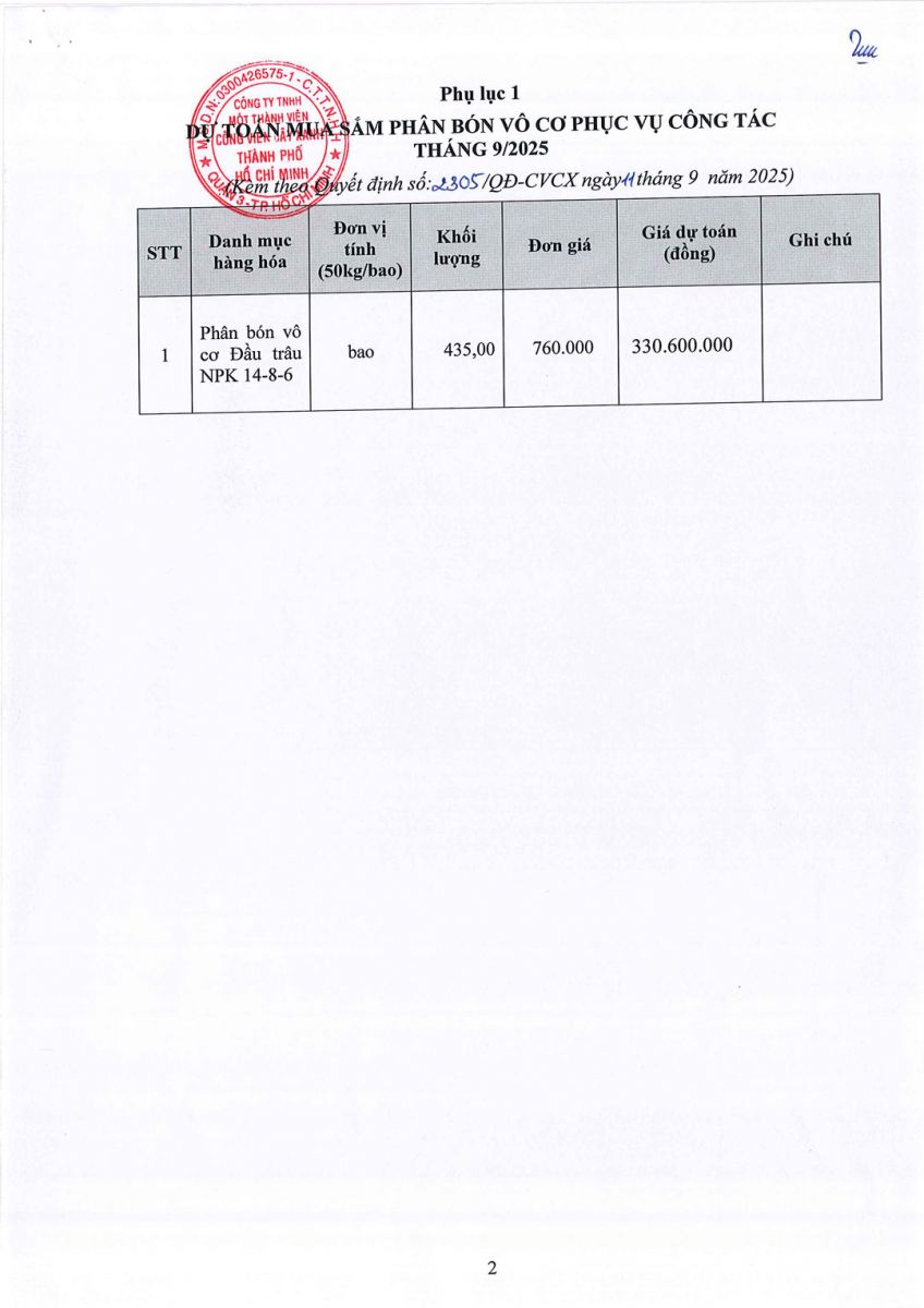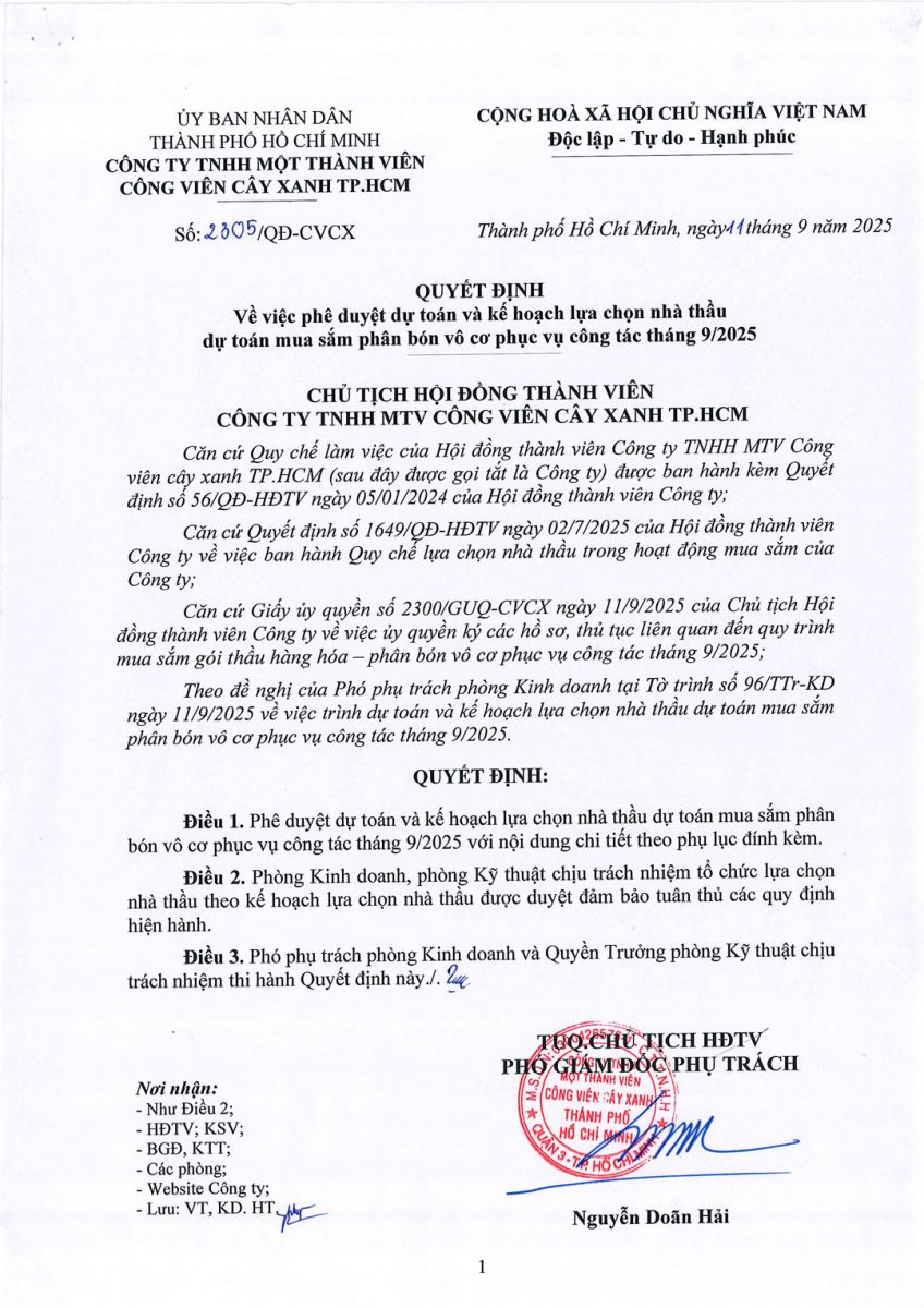 - Quyết định về việc phê duyệt dự toán và kế hoạch lựa chọn nhà thầu dự toán mua sắm phân bón vô cơ phục vụ công tác tháng 9/2025