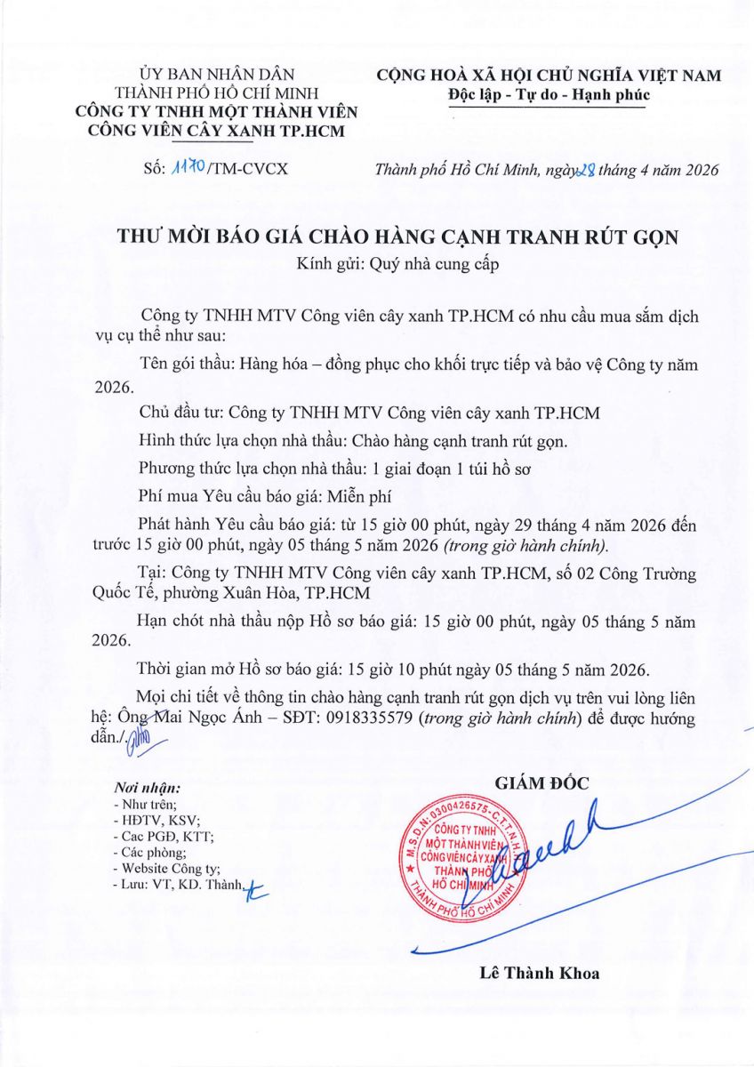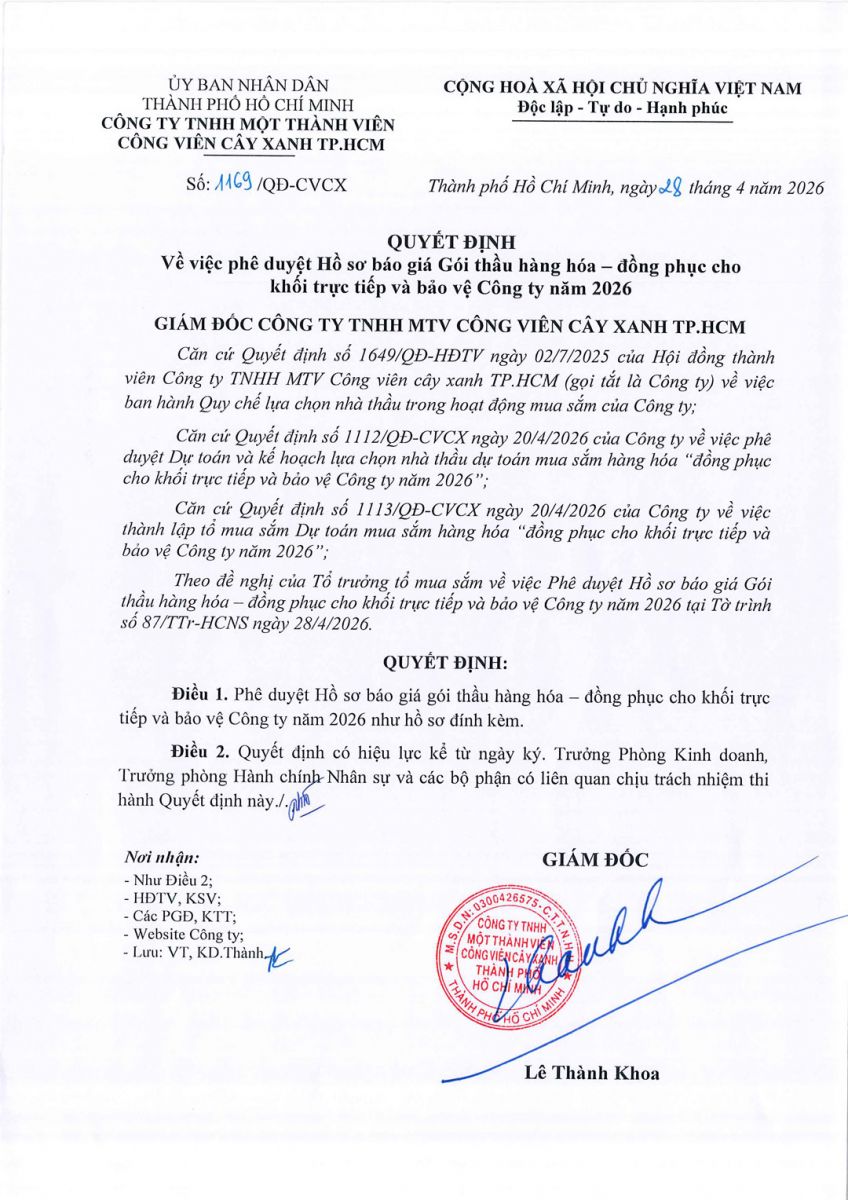Quyết định Về việc phê duyệt Hồ sơ báo giá Gói thầu hàng hóa – đồng phục cho khối trực tiếp và bảo vệ Công ty năm 2026 và thư mời báo giá chào hàng cạnh tranh rút gọn