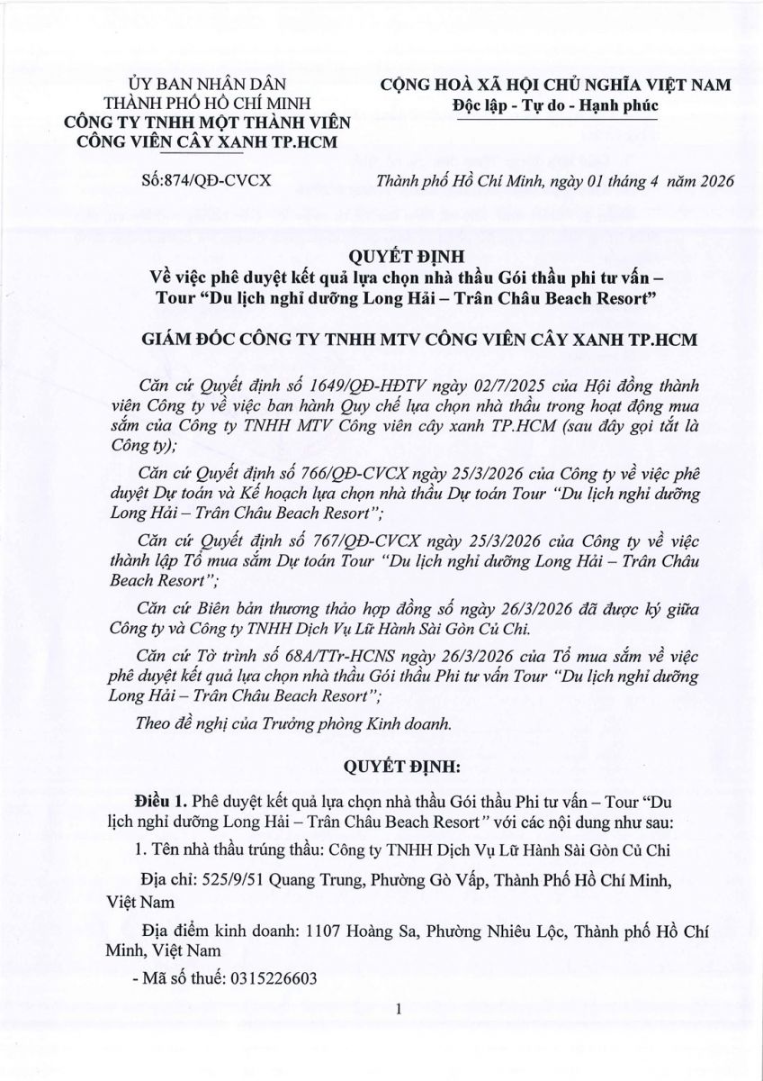 QUYẾT ĐỊNH Về việc phê duyệt kết quả lựa chọn nhà thầu Gói thầu phi tư vấn – Tour “Du lịch nghỉ dưỡng Long Hải – Trân Châu Beach Resort”