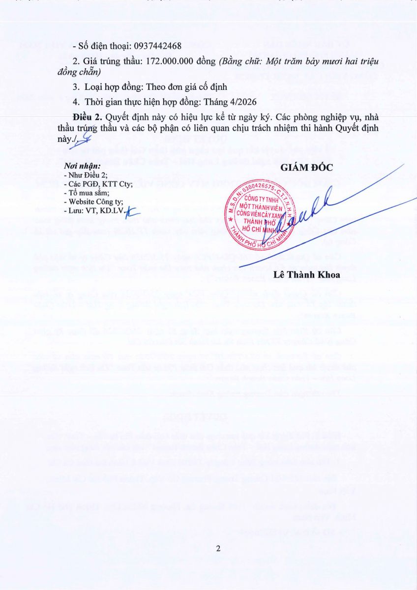 Quyết định Về việc phê duyệt kết quả lựa chọn nhà thầu gói thầu Hàng hóa – vật tư phục vụ hoạt động sản xuất kinh doanh của Công ty năm 2026