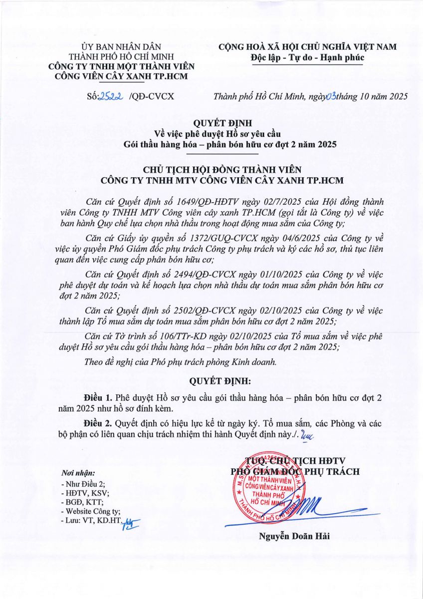 Quyết định số 170/QĐ-CVCX ngày 23/01/2026 của Công ty về việc phê duyệt kết quả lựa chọn nhà thầu Gói thầu vật tư hoa giỏ phục vụ công tác tháng 01/2026 của Công viên Trung Tâm