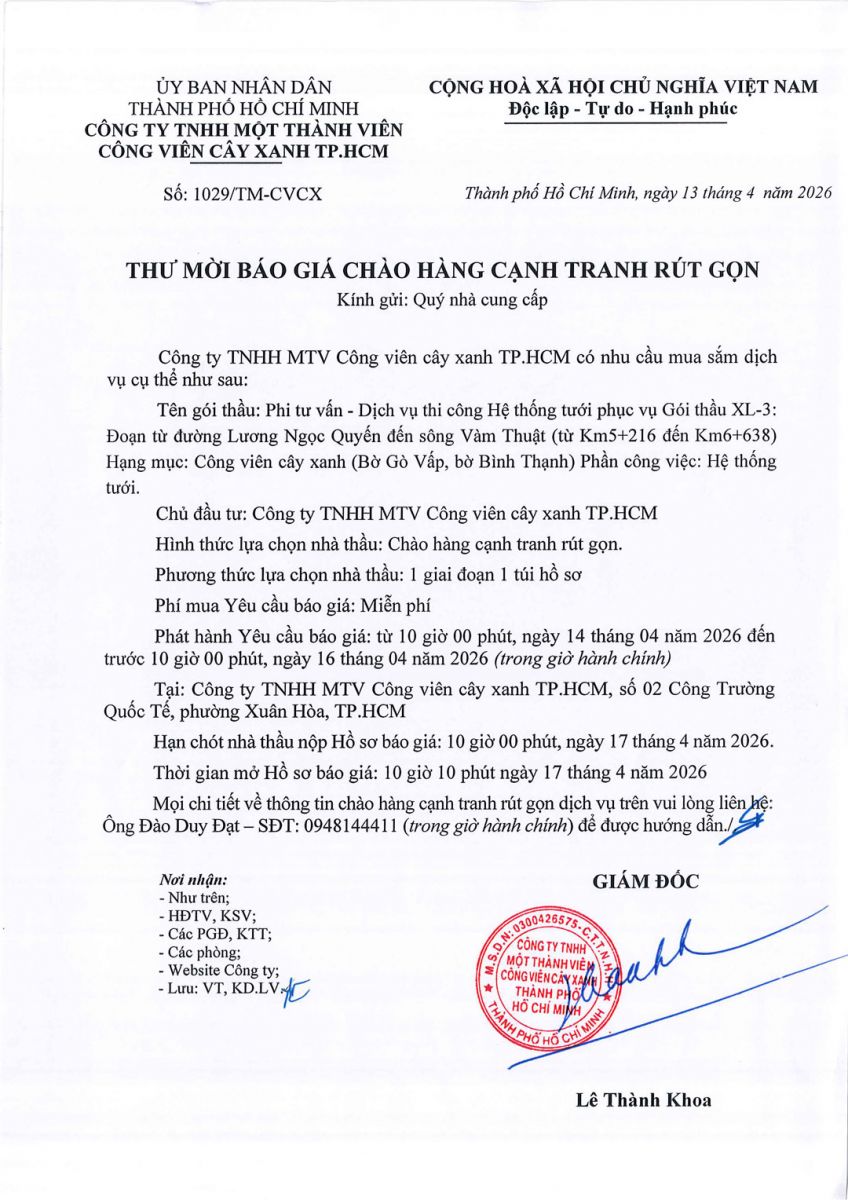 Thư mời báo giá chào hàng cạnh tranh rút gọn gói thầu Phi tư vấn - Dịch vụ thi công Hệ thống tưới phục vụ Gói thầu XL-3